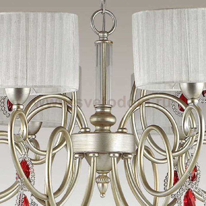 Храктерная особенность артикула 3392/8: Люстра 3392/8 серии Verenissa выполнена из арматуры изысканного цвета "матовое золото" с серебристой патиной. Верх люстры украшен абажурами из полупрозрачной органзы, так красиво искрящейся и наполняющей помещение теплым, лучистым светом. Нижнюю часть светильника украшают изящно изогнутые рожки с подвесками из крупного хрусталя ярко-рубиного цвета, изящно обрамленного прозрачными хрустальными бусинами. Люстра смотрится восхитительно и грациозно, а глубокий, насыщенный рубиновый цвет утонченных подвесок придадут интерьеру шарма, чувственности и страсти. Цоколь E14. Мощность 8*40W. Нет ламп в комплекте.