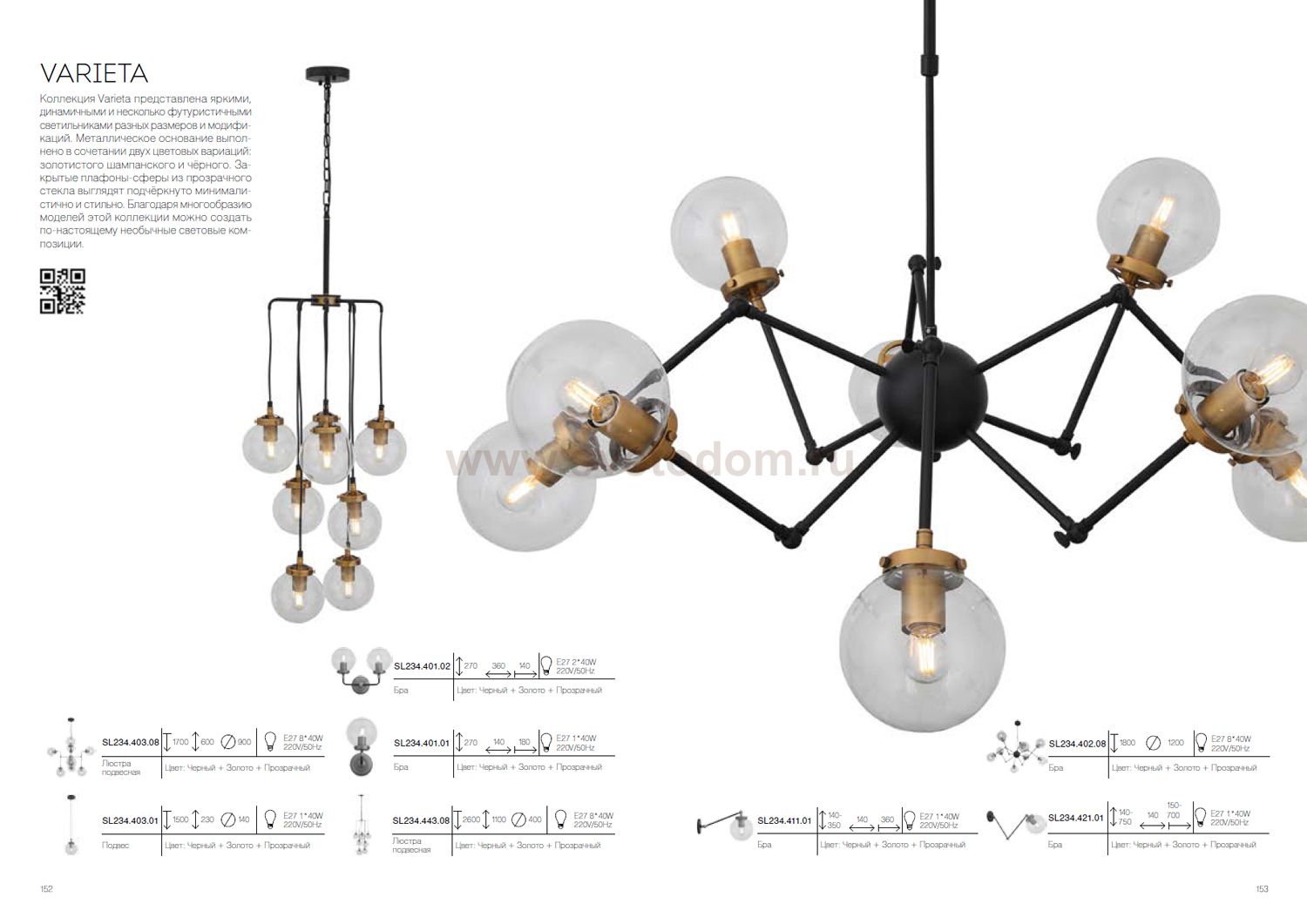 Коллекция Varieta представлена яркими, динамичными и несколько футуристичными светильниками разных размеров и модификаций. Металлическое основание выполнено в сочетании двух цветовых вариаций: золотистого шампанского и чёрного. Закрытые плафоны-сферы из прозрачного стекла выглядят подчёркнуто минималистично и стильно. Благодаря многообразию моделей этой коллекции можно создать по- настоящему необычные световые композиции.