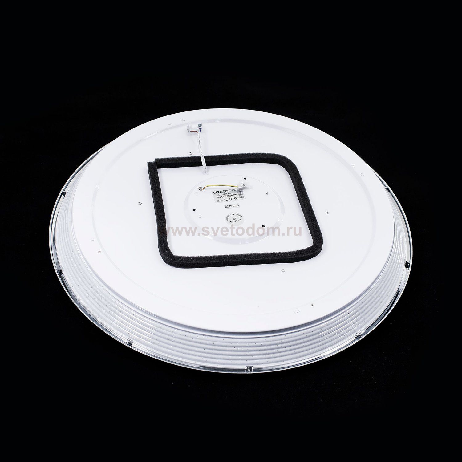 Диаметр 59 см, Высота 8.5 см, светодиодный светильник с управлением с пульта и выключателя, регулировка яркости и цветовой температуры в широких пределах, функция ночника, красивейший эффект "хрустального" света. Технические особенности