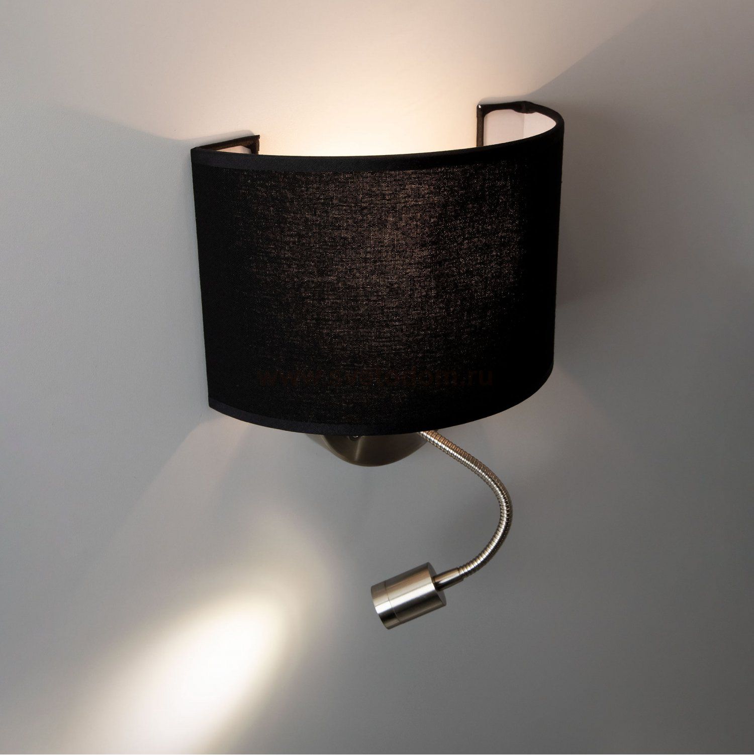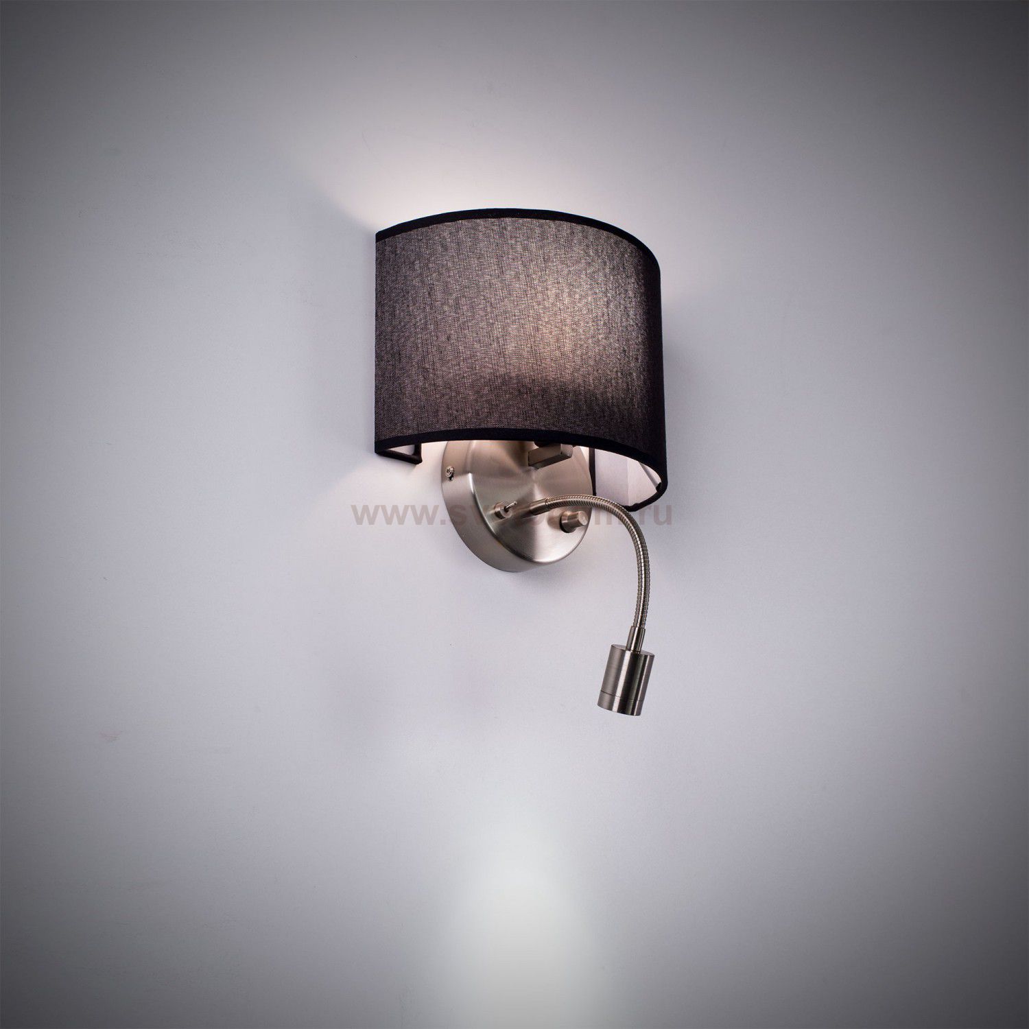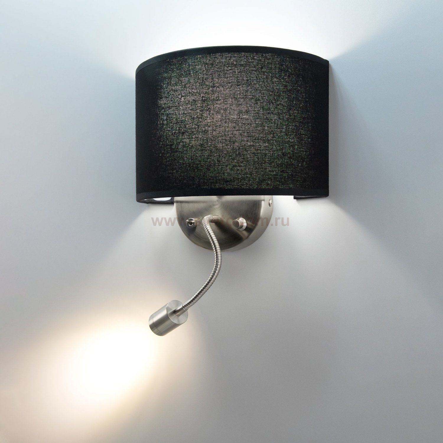 Светильник комбинирует общий и направленный свет с их раздельным включением, Основное назначение - прикроватный светильник, Диммированая лампа Е14*60Вт для общего света, Светодиодная лампа 3Вт теплого света (ЦТ=3000К) с регулировкой положения - для чтения