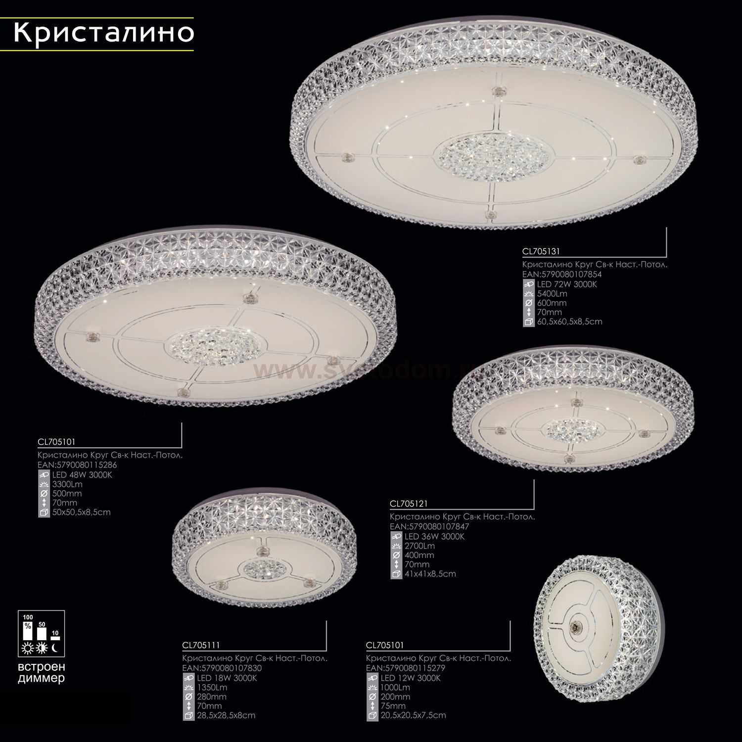 Диаметр 20 см, Высота 7 см, Светодиодный светильник с хрустальным эффектом, Уровень мощности 100-50-10% управляется выключателем Технические особенности