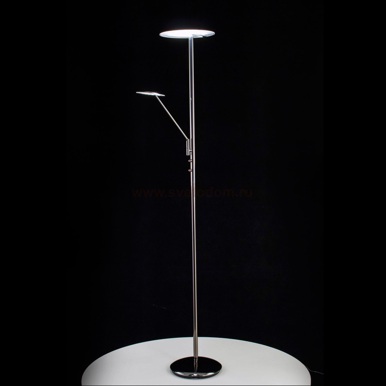 Торшер высотой 180 см с двумя регулируемыми по направлению светодиодными головами, диаметр основания 28см, потолочная голова D=28см с литым корпусом, мощностью18Вт с диммером 20-100%; голова для чтения D=13.5 см с литым корпусом, мощность 5 Вт с диммером Комментарий