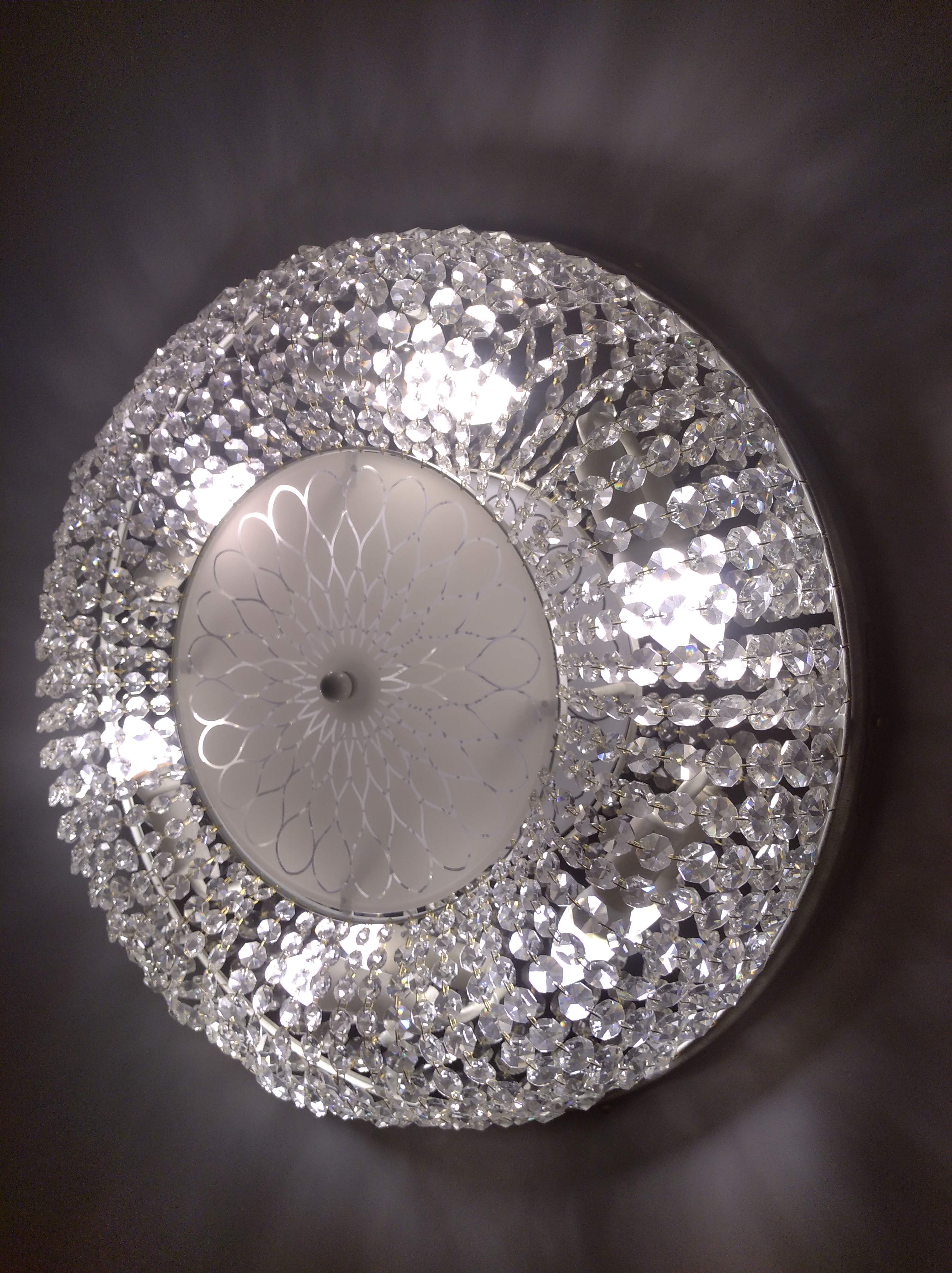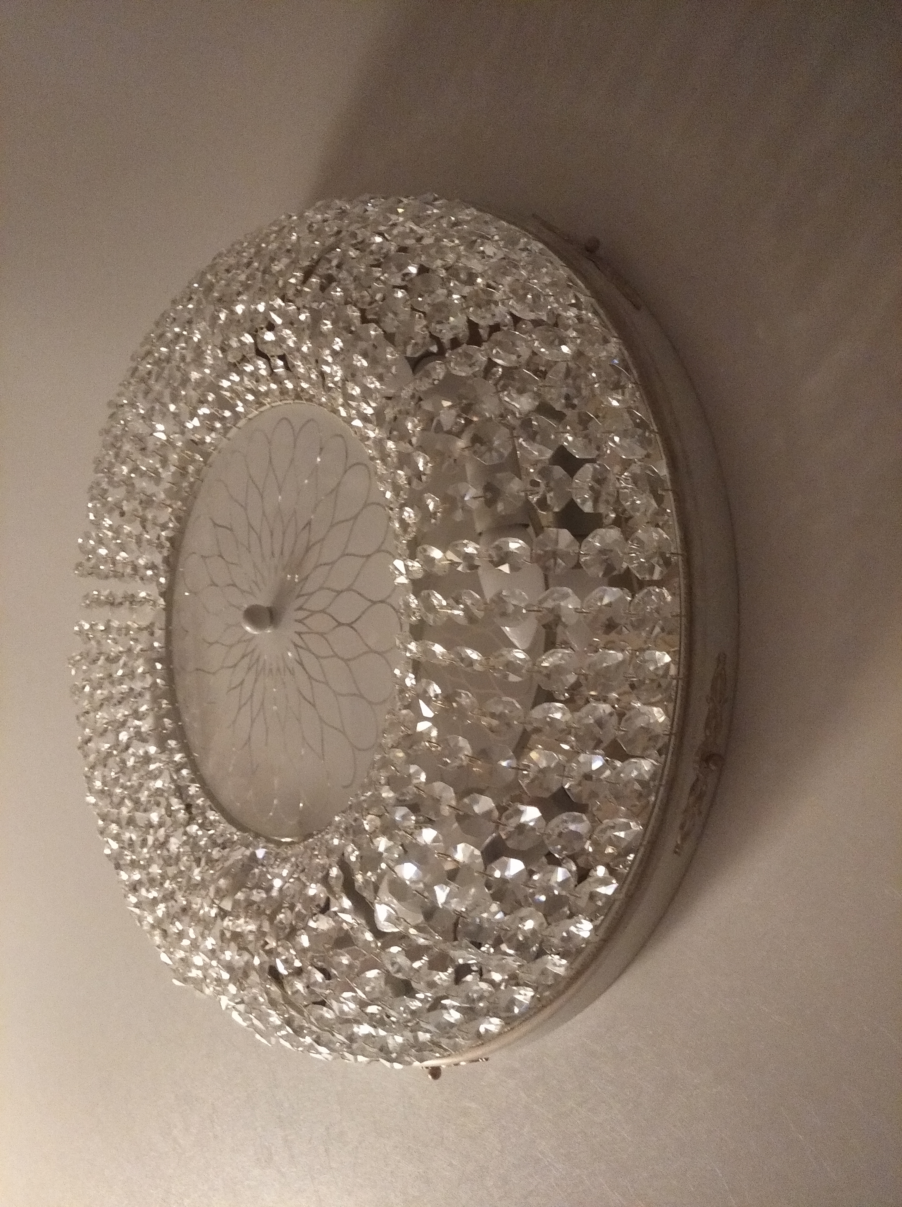 Каркас из металла. Основание декорировано стеклом с пескоструйным рисунком. Подвески из *хрусталя. Комментарий