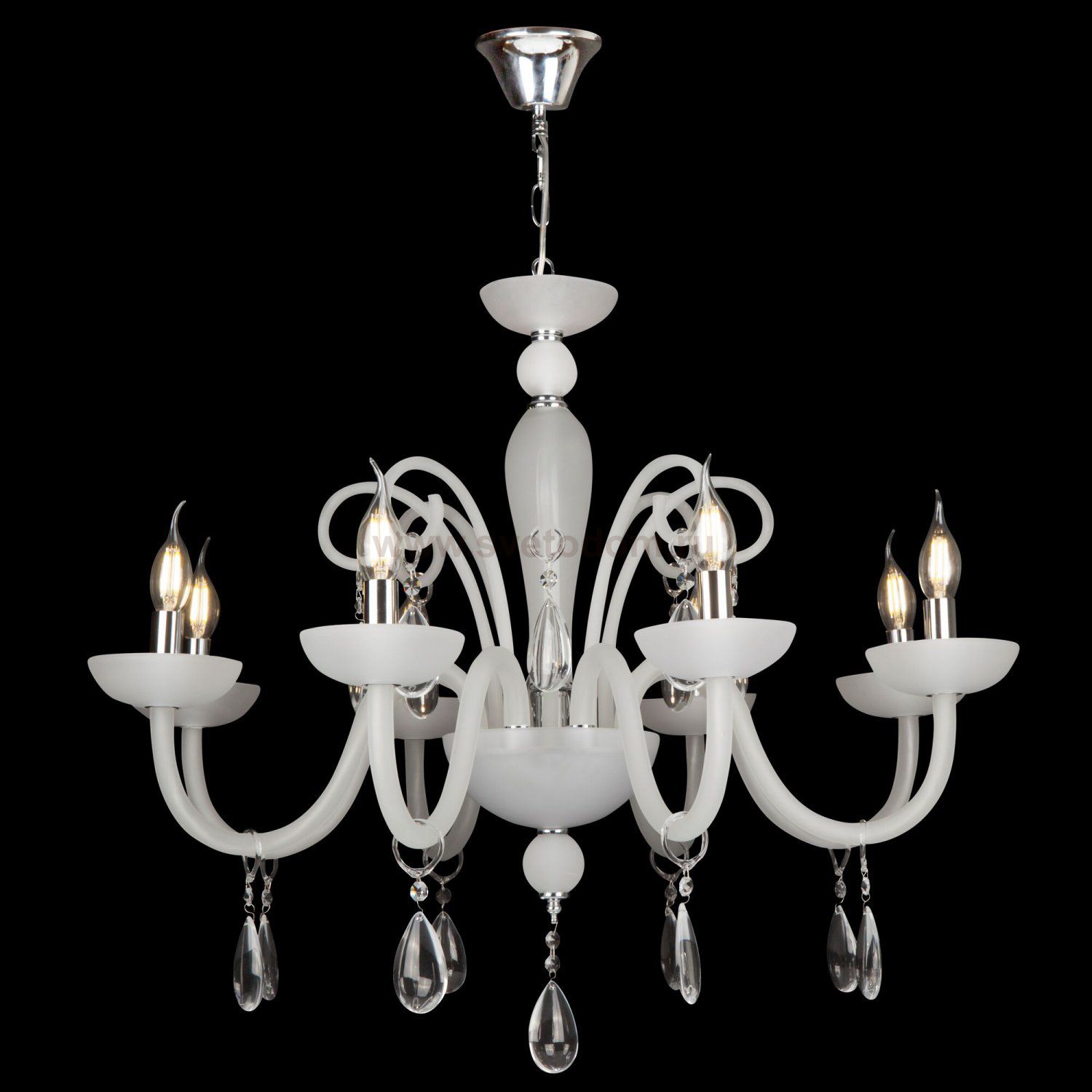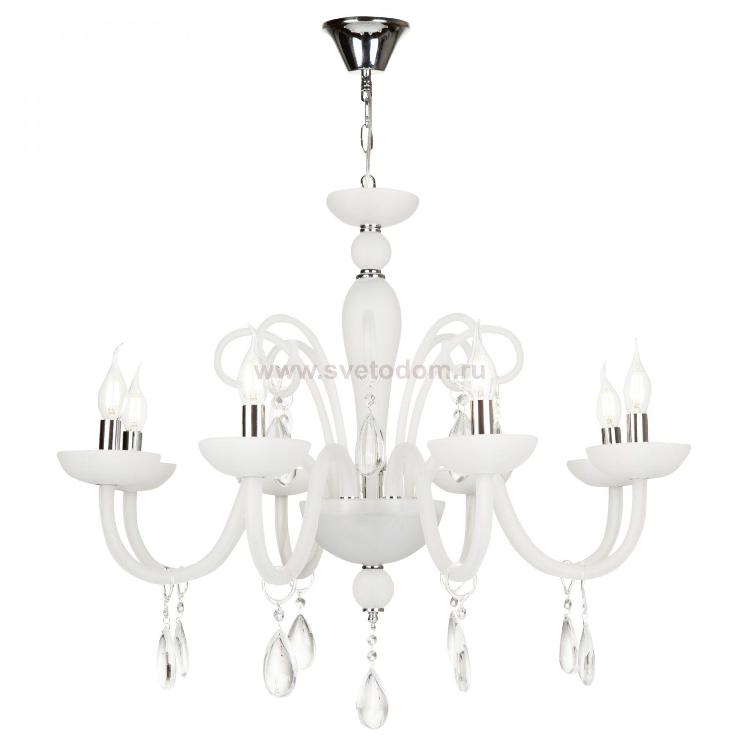 Особенности модели DIA011PL-08W: Оригинальный внешний вид светильников серии обусловлен матовыми стеклянными деталями, которые составляют большую часть конструкции. Светильники украшены подвесками в форме капель. Они закреплены на рожках с помощью стеклянных колец. Высоту люстр возможно изменить, регулируя высоту цепи.