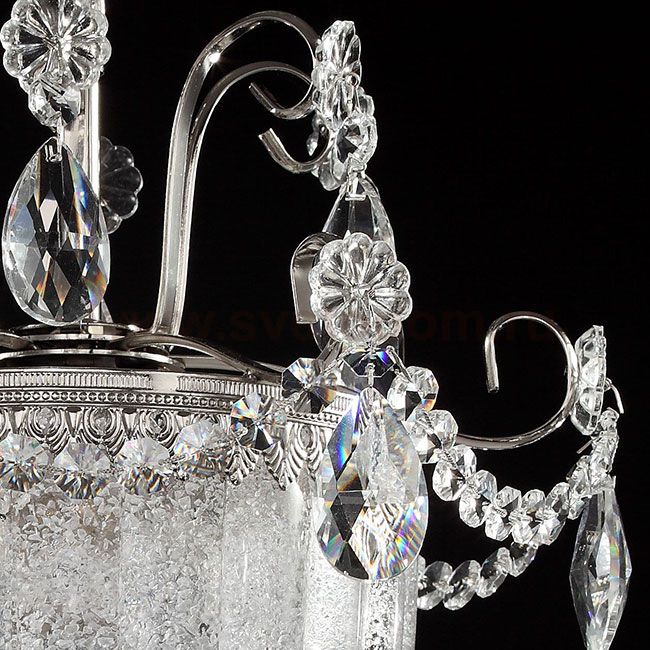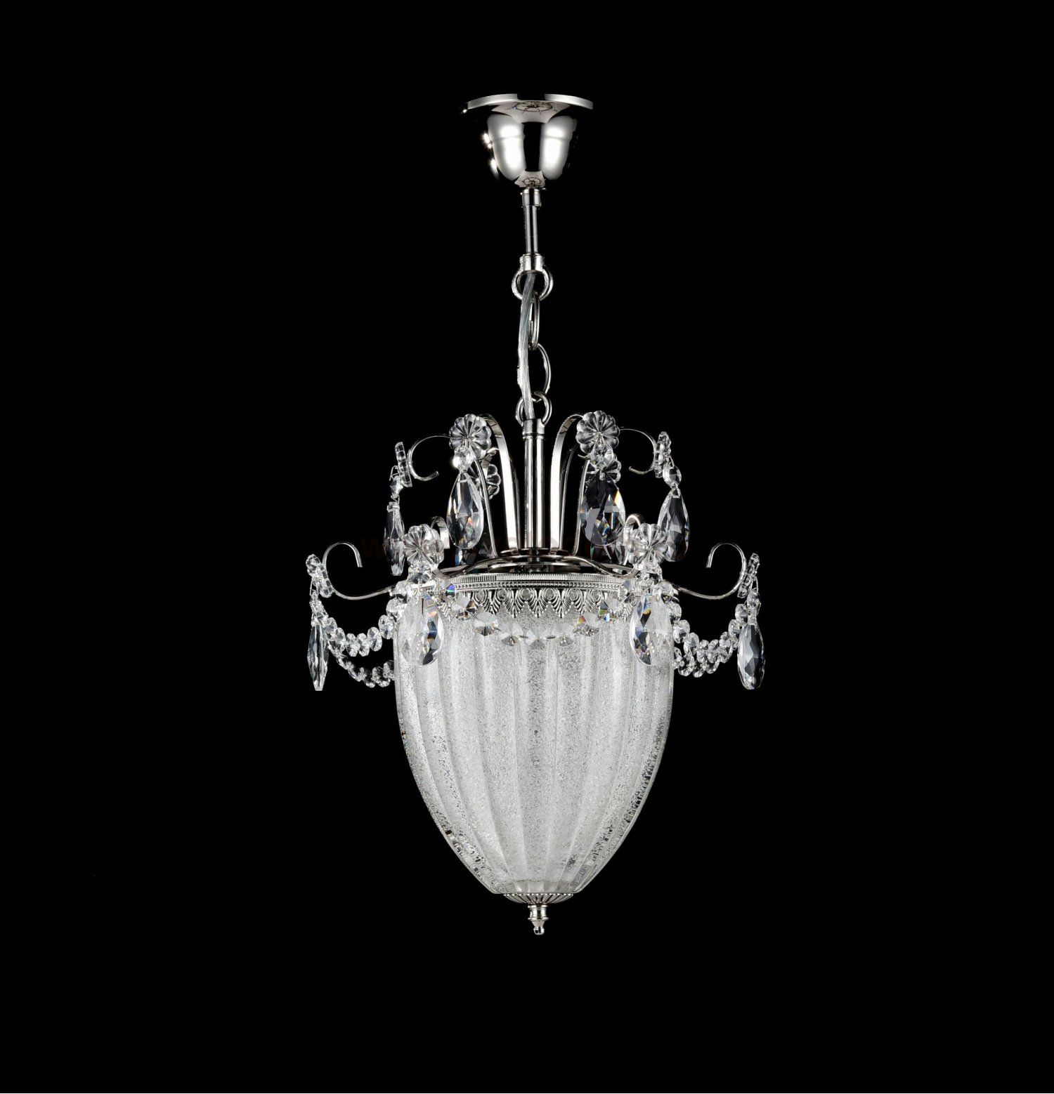 Особенности модели DIA299-11-N: В серии представлена игривая интерпретация классических подвесных светильников, искусно украшенных различным декором. Цветы и капли из кристаллов сплелись воедино и кружатся вокруг центрального плафона из массивного ребристого стекла. Стеклянная крошка, нанесенная с обратной стороны плафона, создает эффект "заморозки". Арматура сделана из хромированного металла. Высота подвесов регулируется длиной цепи.