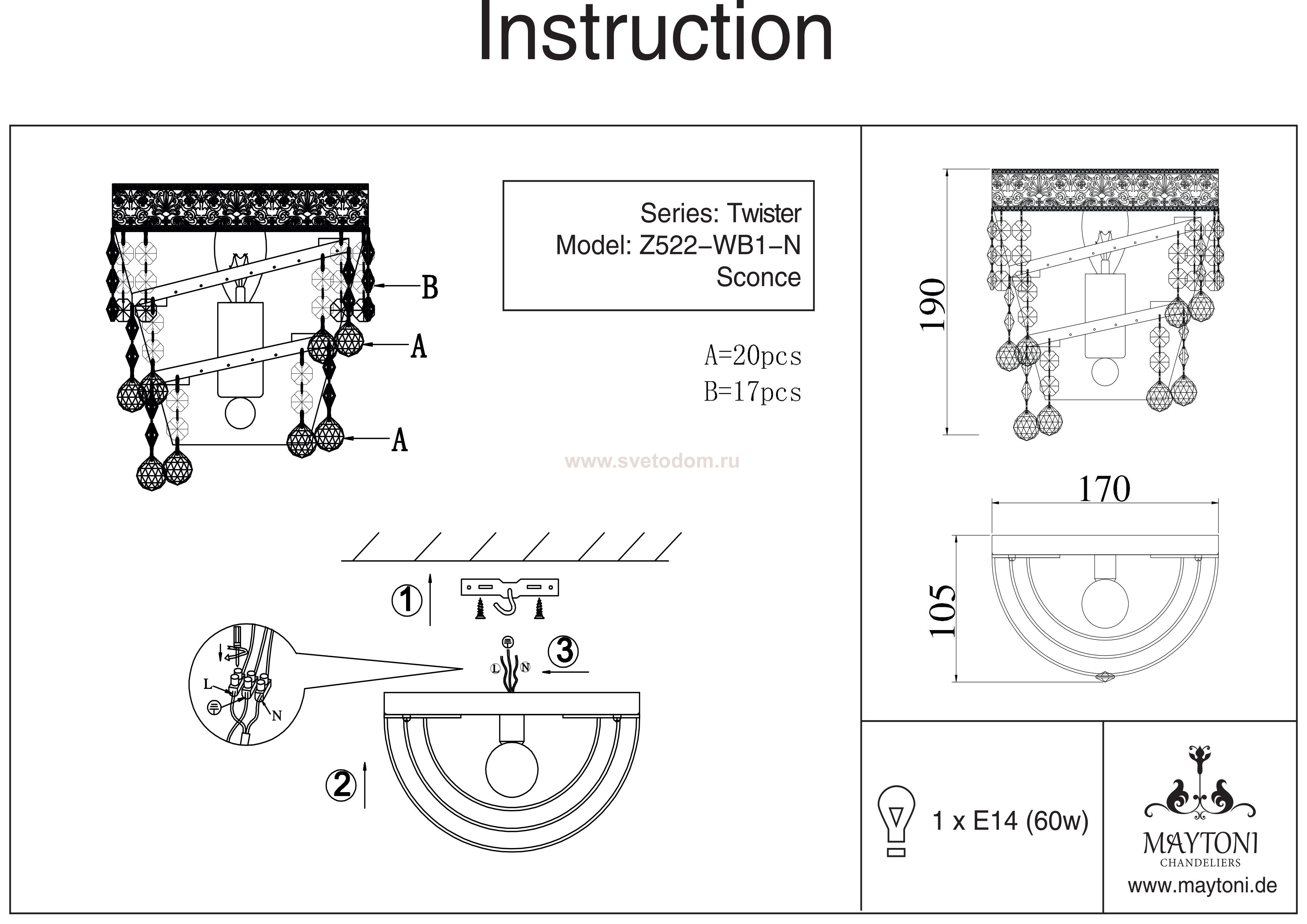 Изысканное немецкое изделие, выполненное с использованием металла цвета никель и роскошного хрусталя, является результатом работы конструкторов компании Maytoni, разработавших представленное на фото хрустальное бра для интерьера в классическом стиле. Хрустальное бра Maytoni Z522-WB1-N состоит из основания, выполненного в виде полукруглого обода, декорированного изящным рисунком, и многочисленных подвесок, соединенных в единую конструкцию плафона. Стоит отметить, что цена подходящего светового элемента не заложена Майтони в стоимость предлагаемого товара, поэтому купить его необходимо отдельно при заказе основного изделия. |