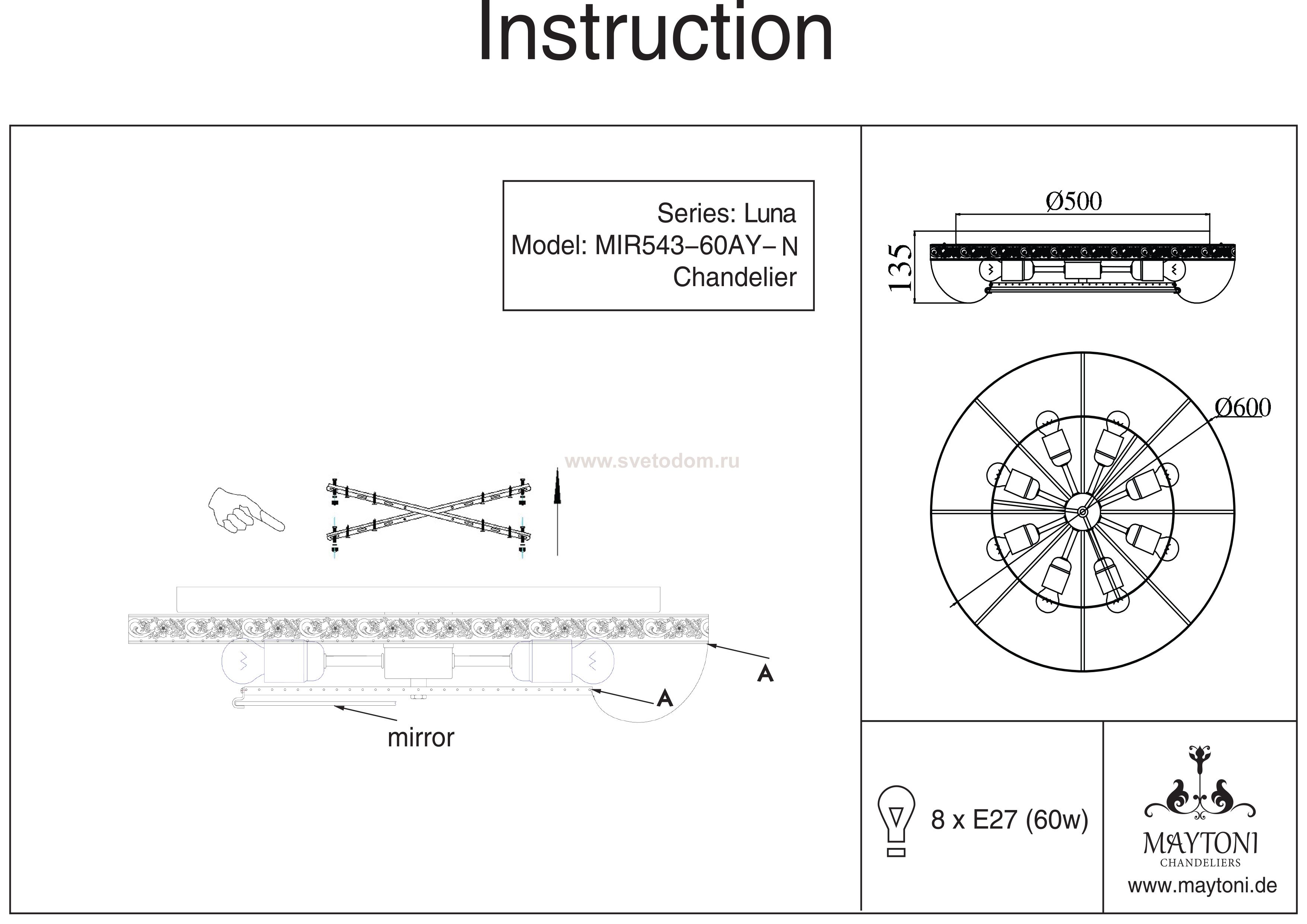 Максимальная потребляемая мощность лампы, которую можно использовать в люстре. Практически для каждой люстры производитель указывает максимальную мощность лампочки. Это связано с тем, что при работе лампы выделяется значительное количество тепла. Если установить лампу большей мощности, то это может привести к деформации и порче люстры, разрушению патрона. От количества ламп и их мощности зависит уровень освещенности комнаты, в которой установлен светильник. Общепринятая норма освещения для ламп накаливания составляет около 15—20 Вт на квадратный метр. Энергосберегающие и светодиодные лампы способны отдавать больше света при меньшем потреблении энергии.