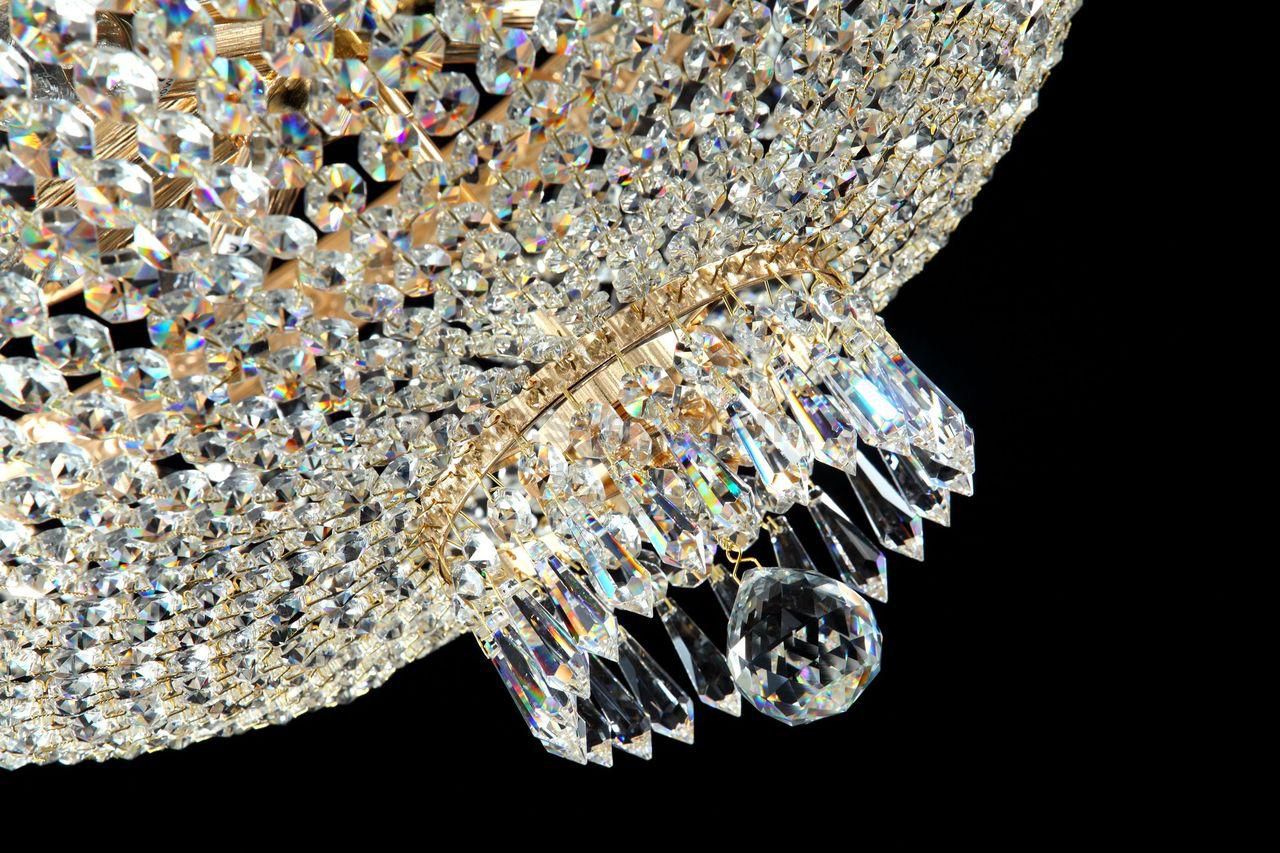 Каркас из металла. Патинированная лента из латуни с узором. Разнообразная огранка подвесок из *хрусталя. Комментарий