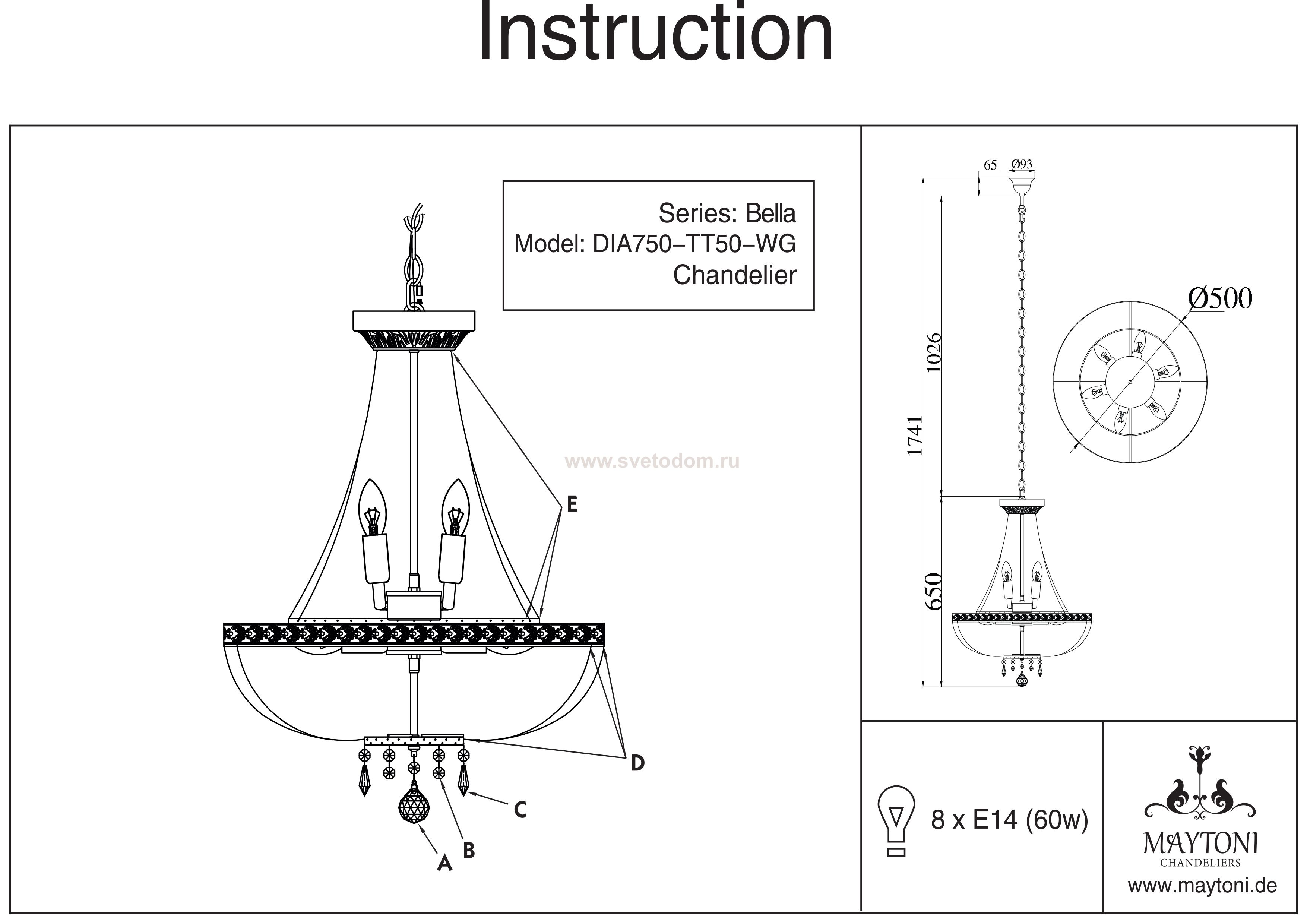 Особенности модели DIA750-TT50-WG: Характерной чертой серии является необычная белая патина, которая нанесена на рельефные детали. Благодаря этому решению конструкция смотрится свежо и ненавязчиво. Кристаллы разного размера и огранки формируют силуэты светильников. Каркас изготовлен из металла с гальваническим покрытием золотого цвета. Предоставляется дополнительный год гарантии.