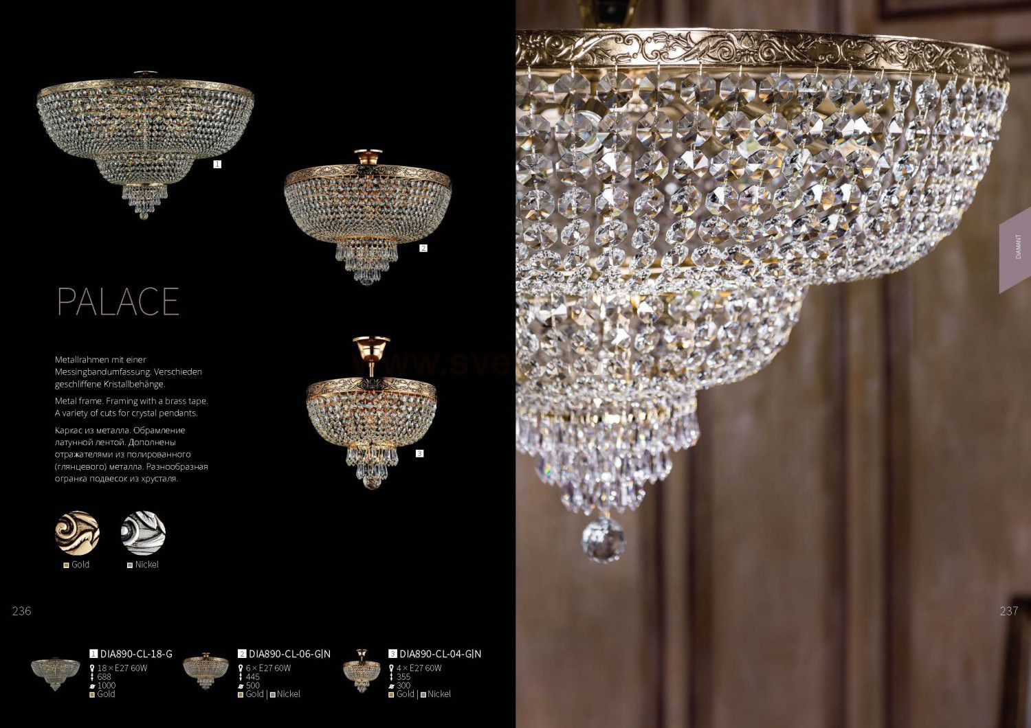 Особенности модели DIA890-CL-06-N: Кристаллы формируют внешний облик светильников серии Palace. В дополнение к ним каждая модель декорирована инкрустированным цветочным орнаментом филигранной проработки. Широкая серия представляет внушительный выбор потолочных и подвесных люстр, бра с источниками света, скрытыми за кристальными гранями и открытыми, в виде свечей. Идеальный аккомпанемент им составит настольная лампа, выполненная в лучших традициях классического стиля. Предоставляется дополнительный год гарантии.