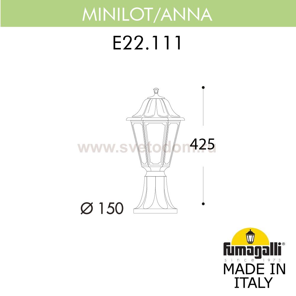Касаемо артикула E22.111.000.AYF1R важно знать - Ландшафтные фонари FUMAGALLI серии ANNA, модель ANNA/MINILOT. Столбик MINILOT с уличным фонарем ANNA. Используются для архитектурного и ландшафтного освещения в стиле "классика". Место установки уличных светильников - перила лестниц, столбы заборов, колонны, тумбы, подпорные стенки, стилобаты, ландшафтные композиции в парках и скверах. В общем, там, где светильник находится на каком-то возвышении, тумбе или подиуме. Изготовлены в Италии, по уникальным технологиям "FUMAGALLI" из современного композитного полимера RESIN. Этот материал в 5 раз прочнее металла, не ржавеет, не окисляется, не выгорает на солнце, его не нужно красить. Все светильники пыле-влаго защищены по стандарту IP44 (защита от попадания твердых частиц более 1мм., защита от капель или брызг, падающих под любым углом). Рассеиватель выполнен из антивандального, не мутнеющего и не горючего PMMA (ПолиМетилМетаАкрилат). Срок службы светильника - не менее 20 лет. Температура использования от -60 до +90. В серии ANNA есть фонари в настенном (BISSO/ANNA, PORPORA/ANNA) подвесном (SICHEM/ANNA, SICHEM/ANNA 3L) и наземном исполнении (IAFAET.R/ANNA, ALOE.R/ANNA, ARTU/ANNA, GIGI/ANNA, RICU/ANNA, RICU/ISSO/ANNA 1L, RICU/ISSO/ANNA 2L, RICU/ISSO/ANNA 3L) со столбами разной высоты, с разным количеством и конфигурацией голов. Консоли настенных фонарей и кронштейны светильников на столбах освщения могут устанавливаться вверх/вниз. Столбы выше 150 см имеют в основе мощную стальную трубу с двойной оцинковкой. При заказе требуется выбрать цвет корпуса, цвет плафона и тип патрона (Е-27 или LED GX-53). Возможен светодиодный вариант. По стилю и дизайну серия уличных светильников ANNA похожа на светильники среднего размера серии RUT и на светильники большого размера серии NOEMI. По размеру ANNA относится к малым светильникам как серия SABA и GLOBE 250.