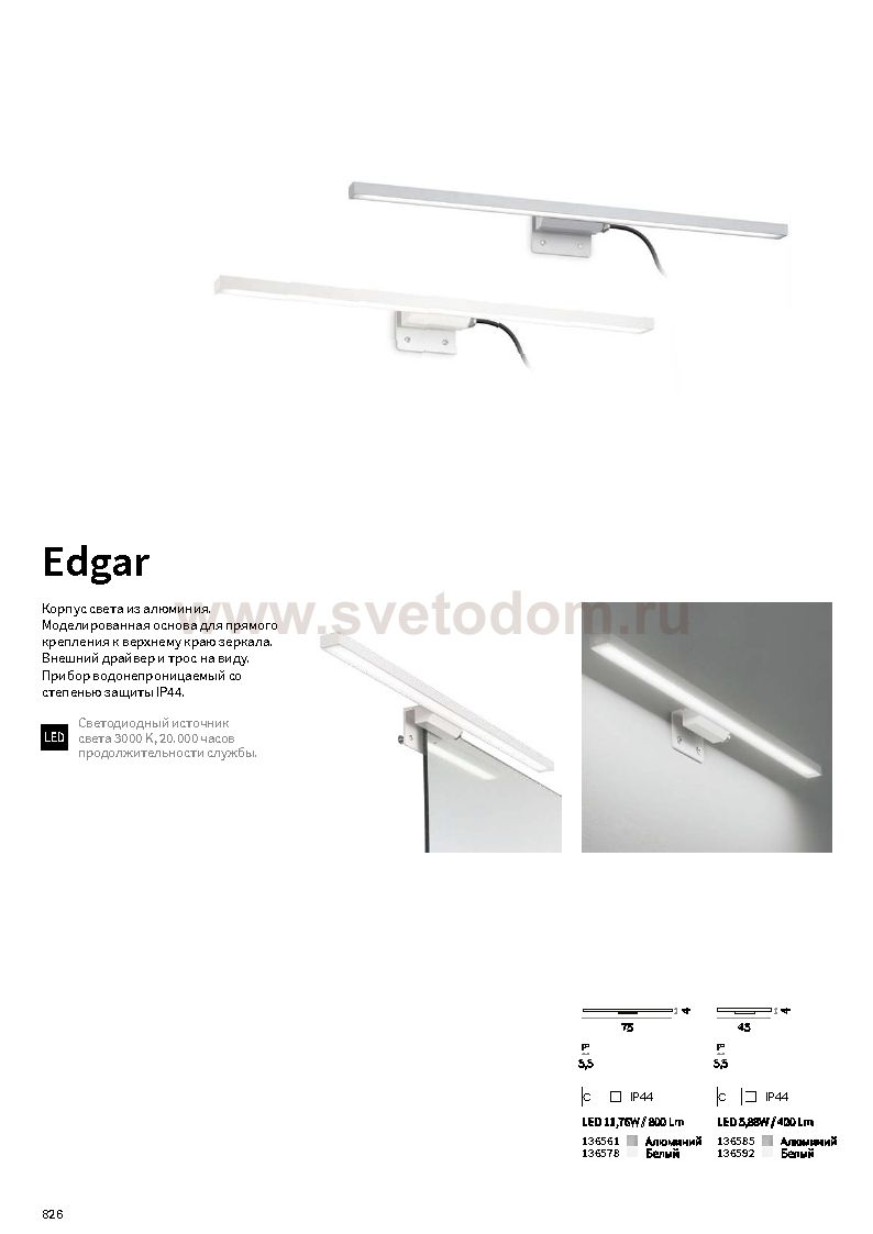 Корпус света из алюминия. Моделированная основа для прямого крепления к верхнему краю зеркала. Внешний драйвер и трос на виду. Прибор водонепроницаемый со степенью защиты IP44.