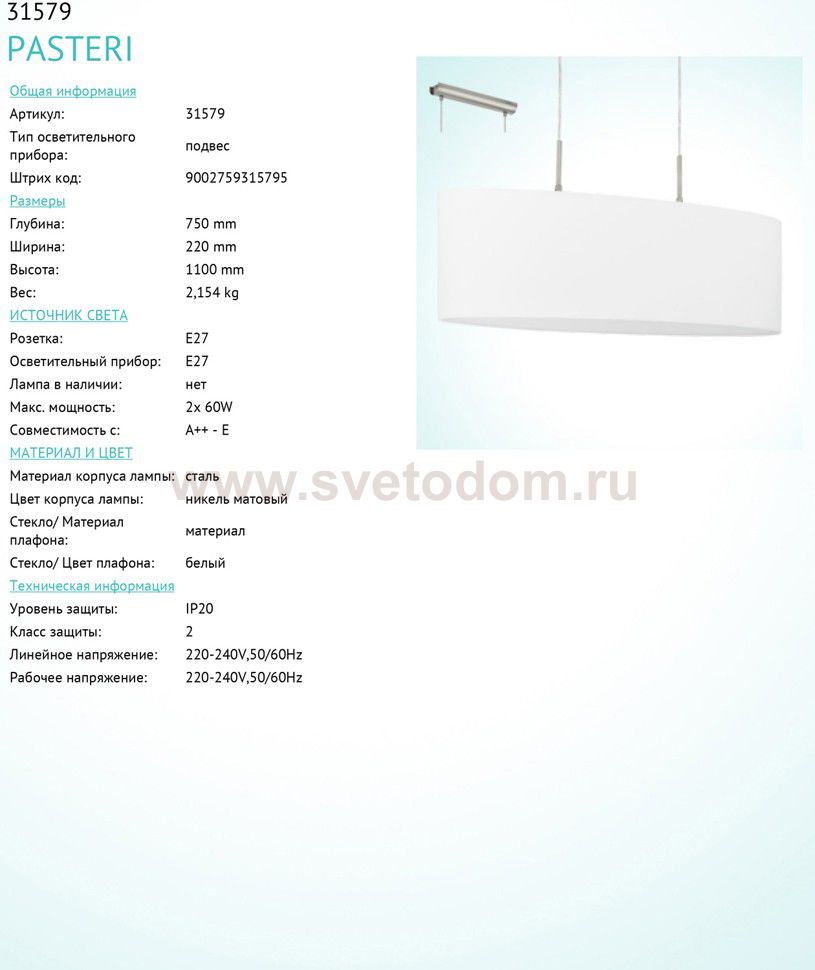 Подвесной светильник – это универсальный вариант, подходящий для любой комнаты. Сегодня производители предлагают огромный выбор таких моделей по самым разным ценам. В каталоге интернет-магазина «Светодом» мы собрали большое количество интересных и оригинальных светильников по выгодной стоимости. Вы можете приобрести их в Москве, Екатеринбурге и любом другом городе России. Подвесной светильник Eglo 31579 сразу же привлечет внимание Ваших гостей благодаря стильному исполнению. Благородный дизайн позволит использовать эту модель практически в любом интерьере. Она обеспечит достаточно света и при этом легко монтируется. Чтобы купить подвесной светильник Eglo 31579, воспользуйтесь формой на нашем сайте или позвоните менеджерам интернет-магазина.