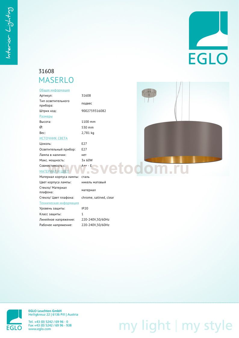 Компания «Светодом» предлагает широкий ассортимент люстр от известных производителей. Представленные в нашем каталоге товары выполнены из современных материалов и обладают отличным качеством. Благодаря широкому ассортименту Вы сможете найти у нас люстру под любой интерьер. Мы предлагаем как классические варианты, так и современные модели, отличающиеся лаконичностью и простотой форм. Стильная люстра Eglo 31608 станет украшением любого дома. Эта модель от известного производителя не оставит равнодушным ценителей красивых и оригинальных предметов интерьера. Люстра Eglo 31608 обеспечит равномерное распределение света по всей комнате. При выборе обратите внимание на характеристики, позволяющие приобрести наиболее подходящую модель. Купить понравившуюся люстру по доступной цене Вы можете в интернет-магазине «Светодом».