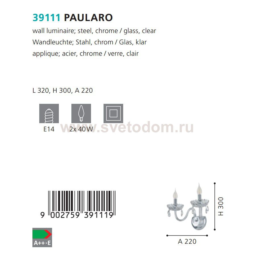 Светильник бра Eglo 39111 PAULARO сделает Ваш интерьер современным, стильным и запоминающимся! Наиболее функционально и эстетически привлекательно модель будет смотреться в гостиной, зале, холле или другой комнате. А в комплекте с люстрой и торшером из этой же коллекции сделает интерьер по-дизайнерски профессиональным и законченным.