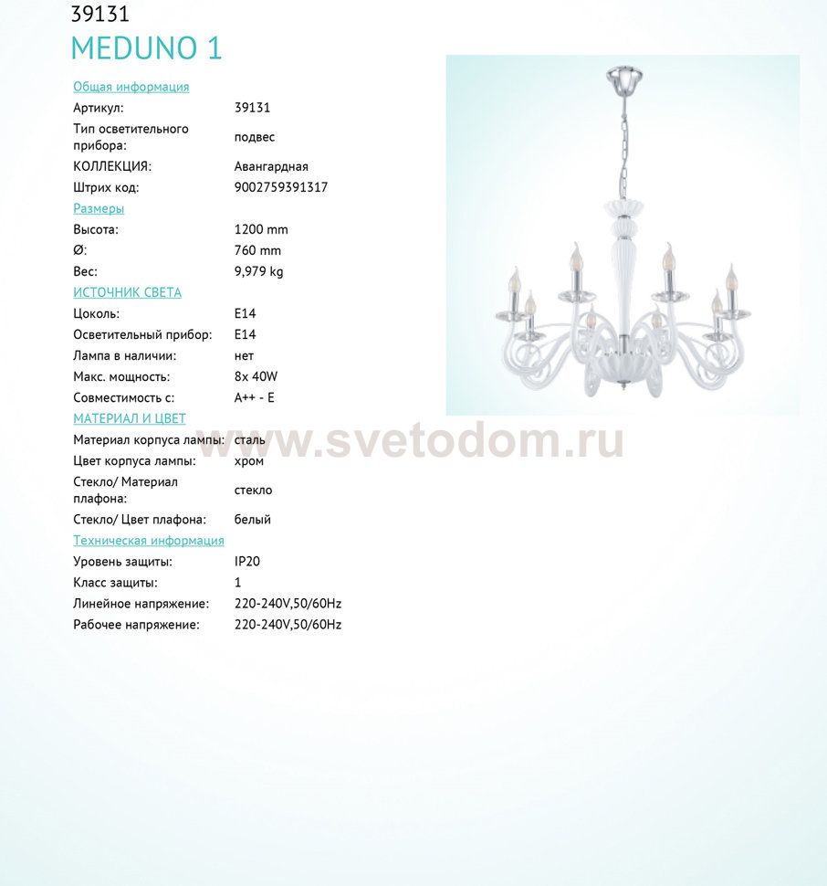 Люстра Eglo 39131 MEDUNO 1 сделает Ваше помещение современным, стильным и запоминающимся! Наиболее эстетически привлекательно и функционально модель будет смотреться как в зале, гостевой, холле или другой комнате. А в совокупности с настенными или напольными светильниками из этой же коллекции, сделает интерьер по-дизайнерски законченным и профессиональным.