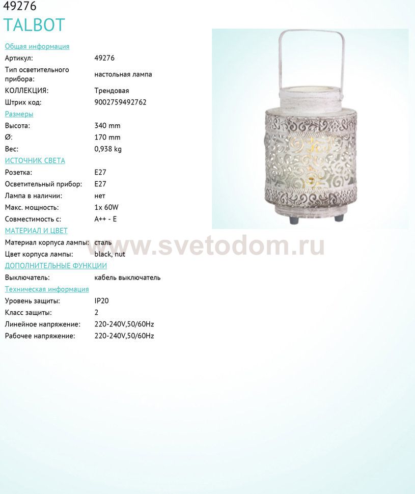 Настольная лампа – это не просто источник дополнительного освещения, но и оригинальный элемент декора. Его можно установить в спальне, гостиной, кабинете и других комнатах. Интернет-магазин «Светодом» предлагает настольные лампы разных стилей по доступным ценам. Благодаря большому ассортименту Вы обязательно найдете в нашем каталоге именно ту модель, которую искали. Настольная лампа Eglo 49276 – прекрасный вариант для завершения интерьера. Ее можно включить одновременно с люстрой для более яркого освещения или без нее для создания уютной атмосферы, настраивающей на отдых. Купить настольную лампу Eglo 49276 Вы можете с помощью виртуальной «Корзины» или по контактным номерам, указанным на сайте.
