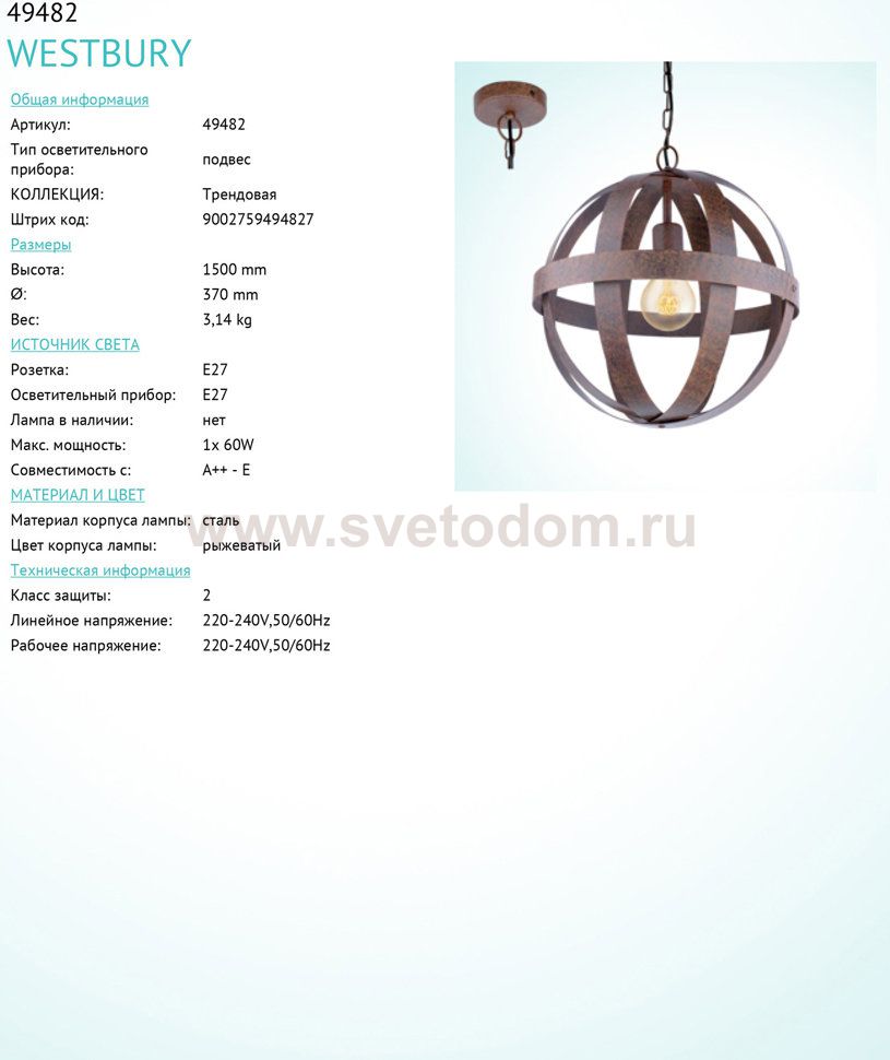 6 Отзывы Подвесный светильник Eglo 49482 WESTBURYПока нет отзывов об этом товаре, напишите и он обязательно появится после модерации! Оставить свой отзывПохожие товары Другие товары магазина Фото