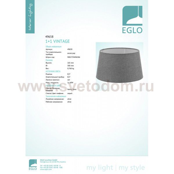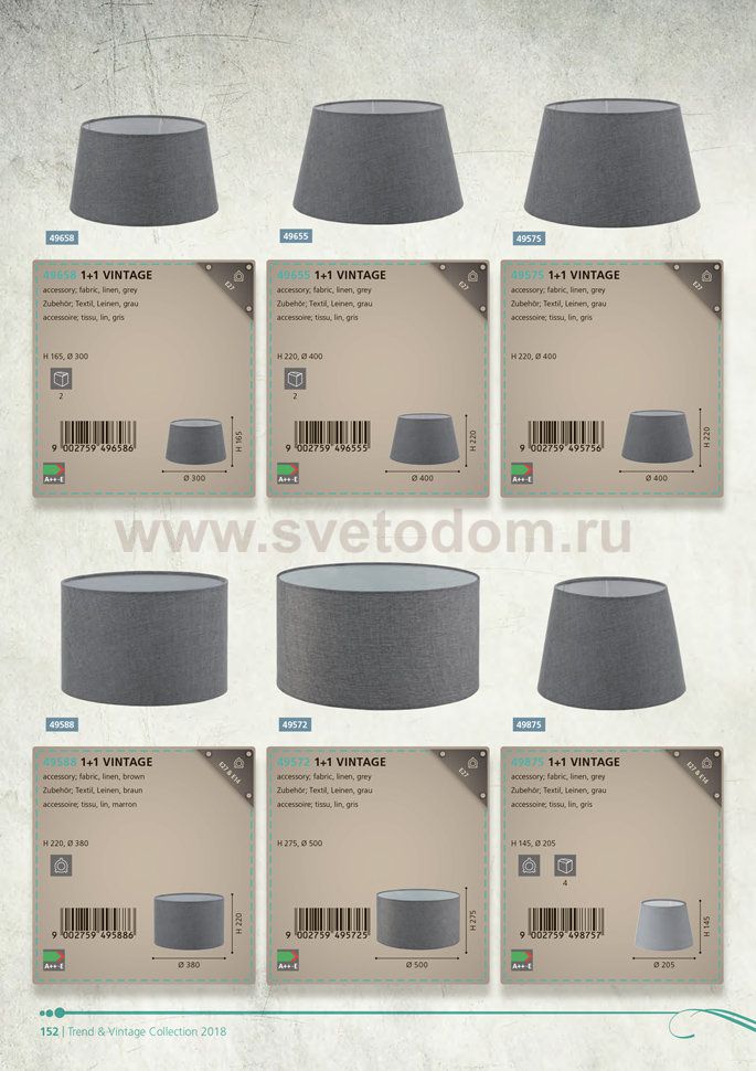 Абажур 1+1VINTAGE, 1х60W(E27), ?300, H165, текстиль, лен, серый применяется преимущественно в домашнем освещении с использованием стандартных выключателей и переключателей для сетей 220V.