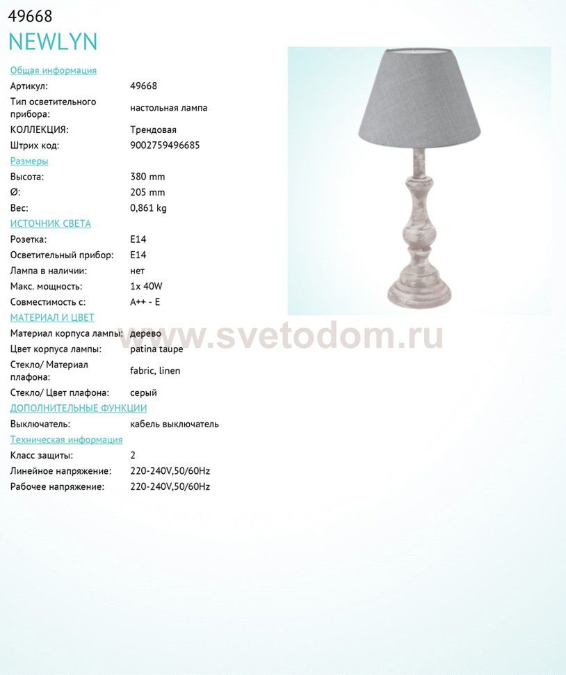 Настольная лампа NEWLYN, 1х40W(E14), ?205, H380, дерево, патина, серо-корич./текстиль, лен, серый применяется преимущественно в домашнем освещении с использованием стандартных выключателей и переключателей для сетей 220V.