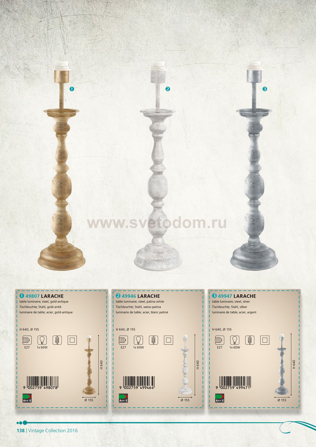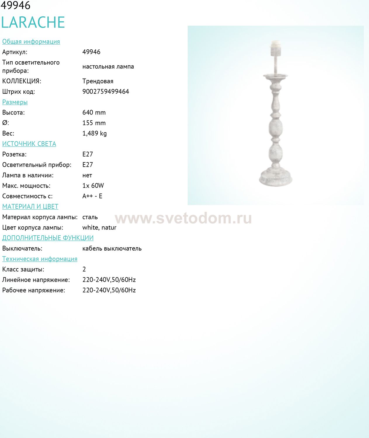 Основа для настольной лампы Eglo 49946 LARACHE обеспечит равномерное распределение света на столе. При выборе обратите внимание на характеристики, позволяющие приобрести наиболее подходящую модель люстры или торшера из аналогичной коллекции и в той же цветовой гамме, что сделает помещение по-дизайнерски профессиональным и законченным.