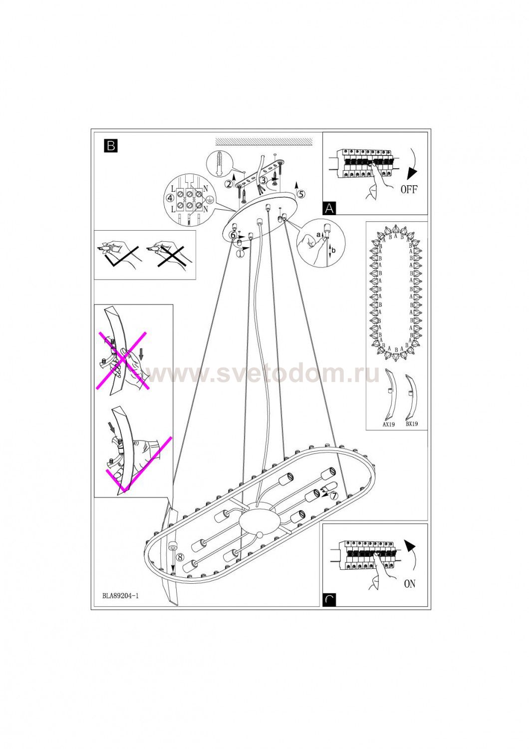 Австрийское качество модели светильника Eglo 89204 не оставит равнодушным каждого купившего! Кристаллы (хрусталь Пр-во Египет Asfour), Хромированное основание, Класс изоляции 2 (плоская вилка, двойная изоляция от вилки до лампы), IP 20, освещенность 3760 lm,L=800B=300Н=1100,8X33W,G9.