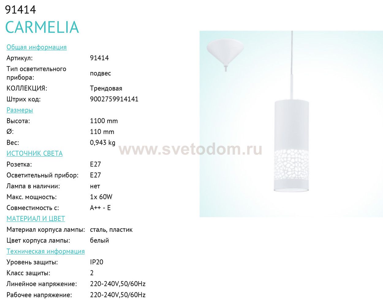 Австрийское качество модели светильника Eglo 91414 не оставит равнодушным каждого купившего! Стальной корпус покрытый дюропластом, Класс изоляции 2 (двойная изоляция), IP 20, освещенность 806 lm ,Н=1100D=110,1X60W,E27.