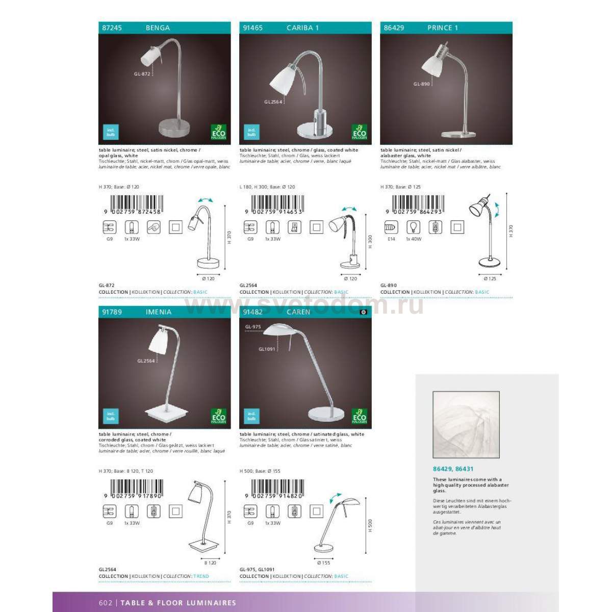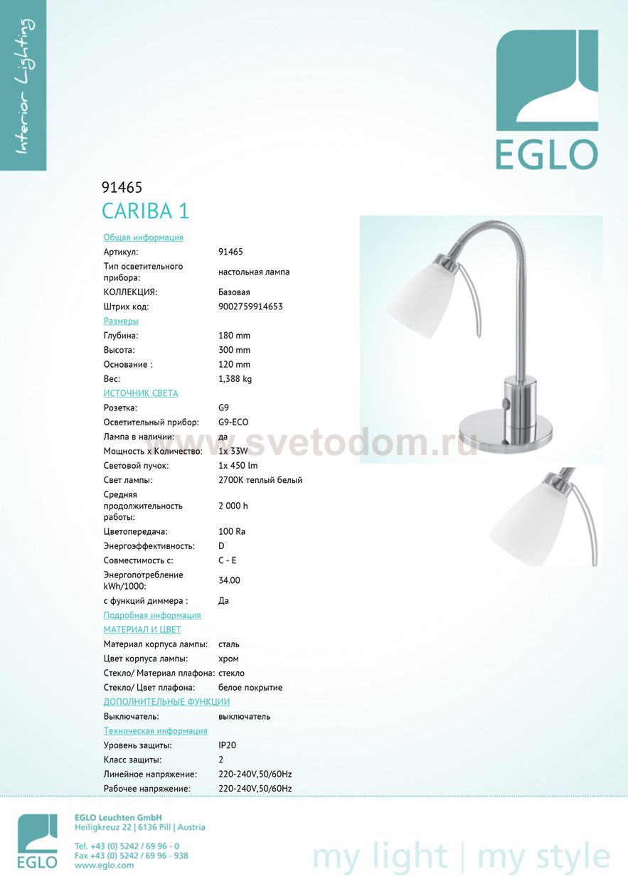 Офисная настольная лампа Eglo 91465 CARIBA 1 обеспечит равномерное распределение света на столе. При выборе обратите внимание на характеристики, позволяющие приобрести наиболее подходящую модель люстры или торшера из аналогичной коллекции и в той же цветовой гамме, что сделает помещение по-дизайнерски профессиональным и законченным.