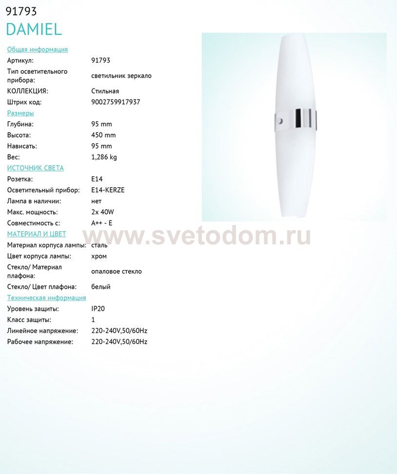 41 Отзывы Светильник для ванной комнаты и зеркал Eglo 91793 DAMIELПока нет отзывов об этом товаре, напишите и он обязательно появится после модерации! Оставить свой отзывПохожие товары Другие товары магазина Фото