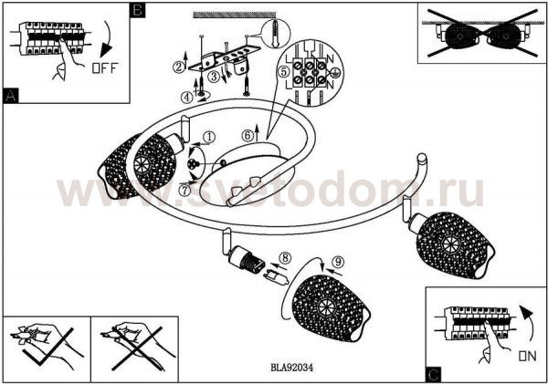 Австрийское качество модели светильника Eglo 92034 не оставит равнодушным каждого купившего! Декоративные ажурные плафоны(сталь хром) с вставками из Хрусталя(Египет), Стальной хромированный корпус, Класс изоляции 2(двойная изоляция), IP 20, Экологически безопасные технологии. освещенность1 410 lm , H=95D=295,3X33W,G9.