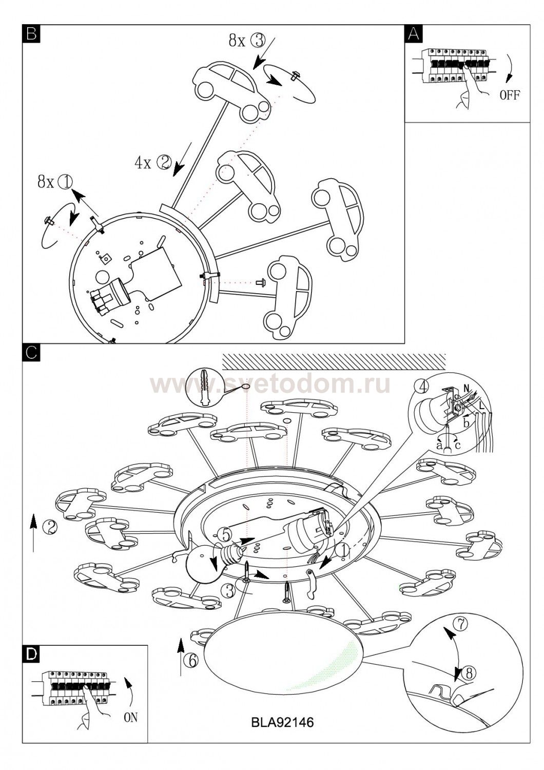 Австрийское качество модели светильника Eglo 92146 не оставит равнодушным каждого купившего! Матовое закаленное стекло(пр-во Чехия), металлический корпус с декоративными элементами деткой тематики, оснащённые вкраплениями накапливающими свет и отдающими его в темноте. Класс изоляции 1, IP 20. ,D=630,1X60W,E27.
