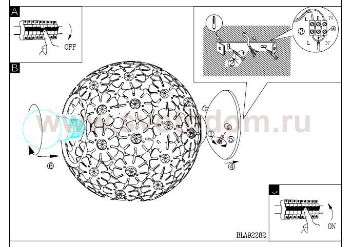 Австрийское качество модели светильника Eglo 92282 не оставит равнодушным каждого купившего! Стальной корпус с защитным покрытием белого цвета, алюминевый ажурный орнамент в виде цветков со вставкми хрусталя, Класс изоляции 2 (двойная изоляция), IP 20, освещенность 806 lm ,Н=200D=180,1X60W,E27.