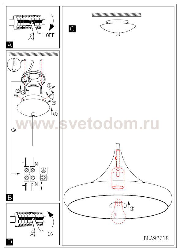 Австрийское качество модели светильника Eglo 92718 не оставит равнодушным каждого купившего! Стальной плафон с защитно/декративным покрытием белого цвета. Класс изоляции 2 (двойная изоляция до лампы), IP 20, освещенность 806 lm ,Н=1100D=400,1X60W,E27.