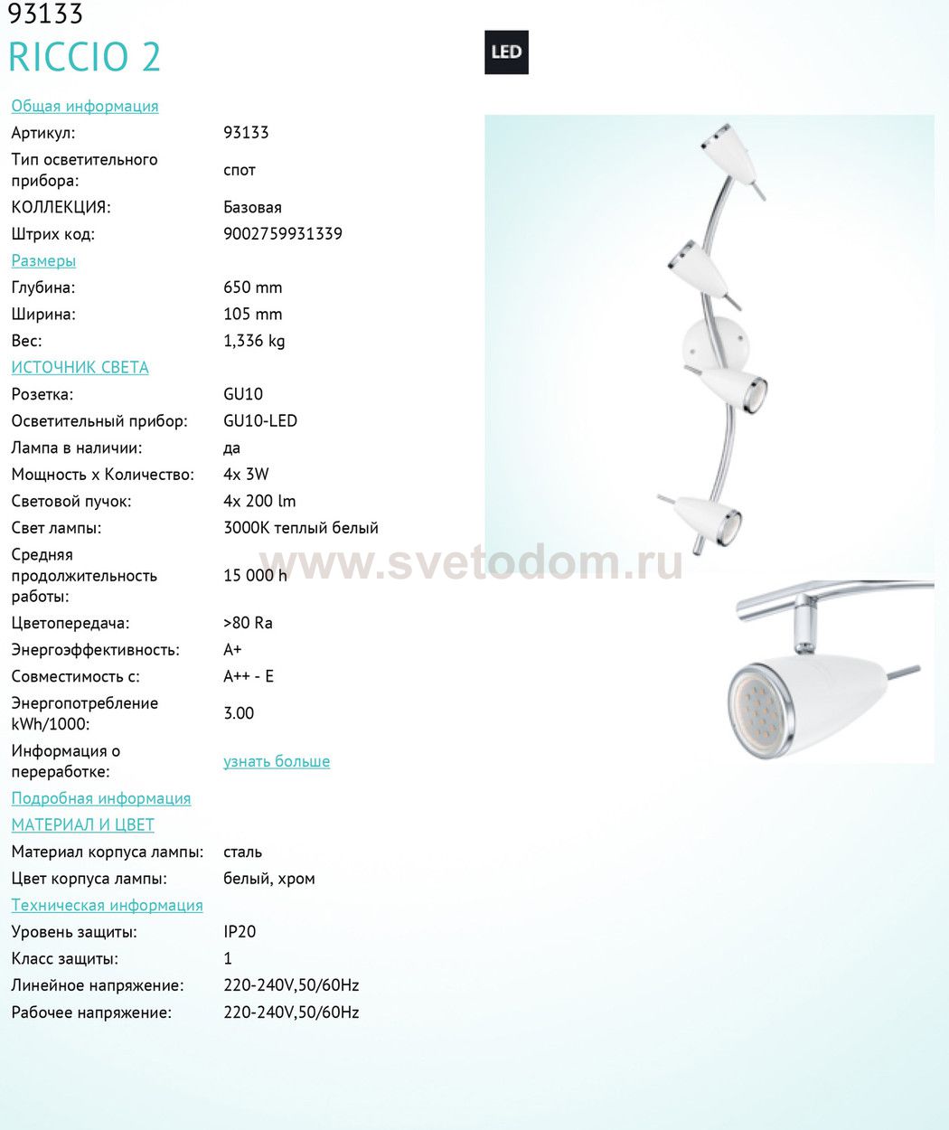 Светильники-споты – это оригинальные изделия с современным дизайном. Они позволяют не ограничивать свою фантазию при выборе освещения для интерьера. Такие модели обеспечивают достаточно качественный свет. Благодаря компактным размерам Вы можете использовать несколько спотов для одного помещения. Интернет-магазин «Светодом» предлагает необычный светильник-спот Eglo 93133 по привлекательной цене. Эта модель станет отличным дополнением к люстре, выполненной в том же стиле. Перед оформлением заказа изучите характеристики изделия. Купить светильник-спот Eglo 93133 в нашем онлайн-магазине Вы можете либо с помощью формы на сайте, либо по указанным выше телефонам. Обратите внимание, что у нас склады не только в Москве и Екатеринбурге, но и других городах России.