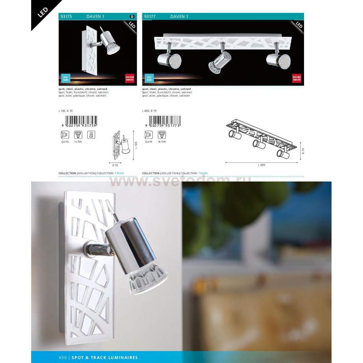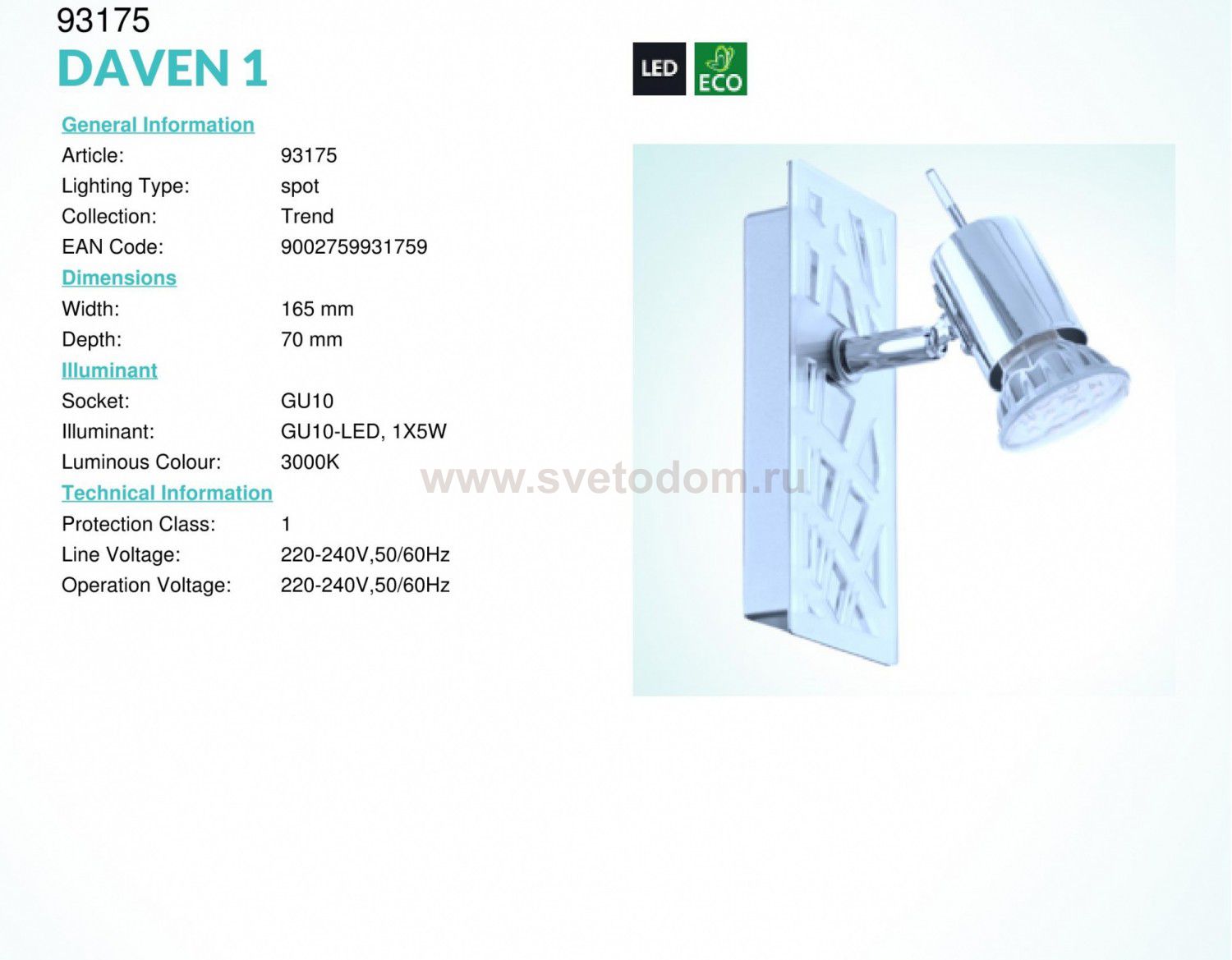 Светильник спот Eglo 93175 DAVEN 1 отличается поворотной способностью регулировки светового потока и сделает Ваше помещение современным, стильным и запоминающимся! Наиболее функционально и эстетически привлекательно модель будет смотреться в гостиной, зале, холле или другой комнате. А в комплекте с люстрой, бра или торшером из этой же коллекции сделает интерьер по-дизайнерски профессиональным и законченным.