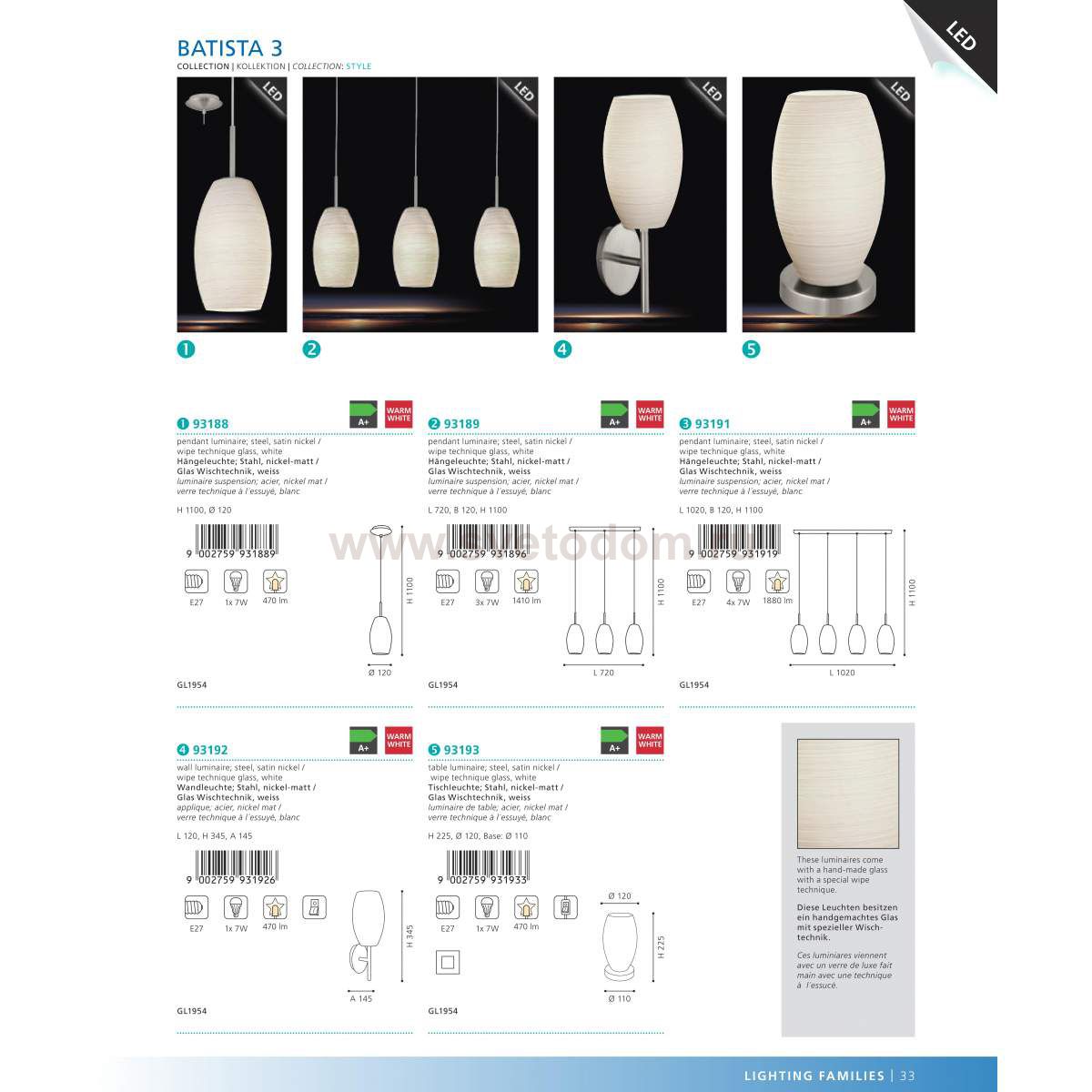 GL1954 Отзывы Светильник подвесной Eglo 93191 BATISTA 3Пока нет отзывов об этом товаре, напишите и он обязательно появится после модерации! Оставить свой отзывПохожие товары Другие товары магазина Фото