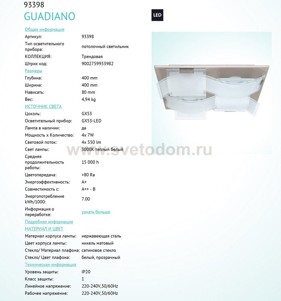 Компания «Светодом» предлагает широкий ассортимент люстр от известных производителей. Представленные в нашем каталоге товары выполнены из современных материалов и обладают отличным качеством. Благодаря широкому ассортименту Вы сможете найти у нас люстру под любой интерьер. Мы предлагаем как классические варианты, так и современные модели, отличающиеся лаконичностью и простотой форм. Стильная люстра Eglo 93398 станет украшением любого дома. Эта модель от известного производителя не оставит равнодушным ценителей красивых и оригинальных предметов интерьера. Люстра Eglo 93398 обеспечит равномерное распределение света по всей комнате. При выборе обратите внимание на характеристики, позволяющие приобрести наиболее подходящую модель. Купить понравившуюся люстру по доступной цене Вы можете в интернет-магазине «Светодом».