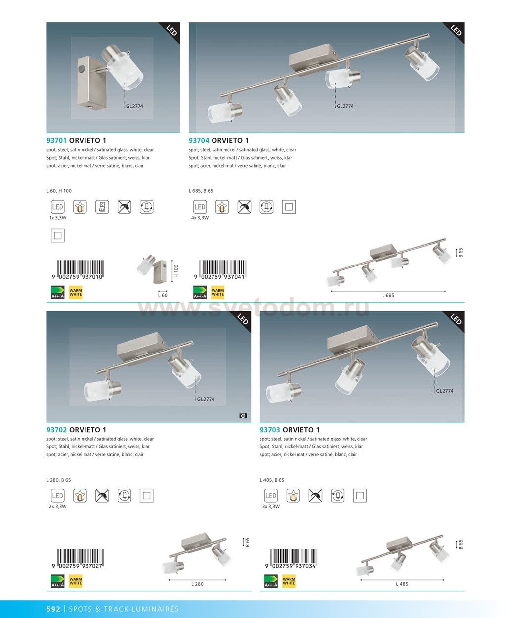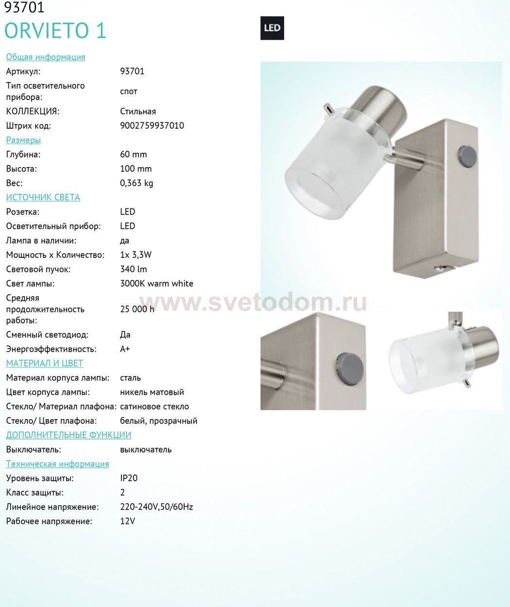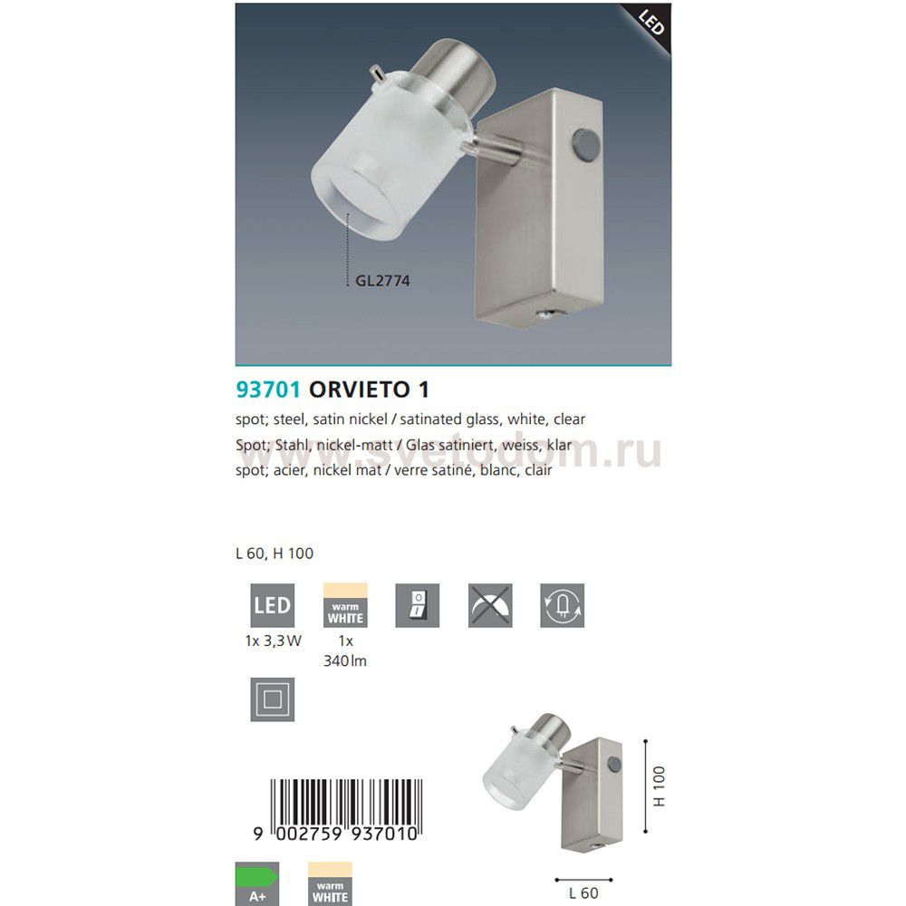 Светильники-споты – это оригинальные изделия с современным дизайном. Они позволяют не ограничивать свою фантазию при выборе освещения для интерьера. Такие модели обеспечивают достаточно качественный свет. Благодаря компактным размерам Вы можете использовать несколько спотов для одного помещения. Интернет-магазин «Светодом» предлагает необычный светильник-спот Eglo 93701 по привлекательной цене. Эта модель станет отличным дополнением к люстре, выполненной в том же стиле. Перед оформлением заказа изучите характеристики изделия. Купить светильник-спот Eglo 93701 в нашем онлайн-магазине Вы можете либо с помощью формы на сайте, либо по указанным выше телефонам. Обратите внимание, что у нас склады не только в Москве и Екатеринбурге, но и других городах России.