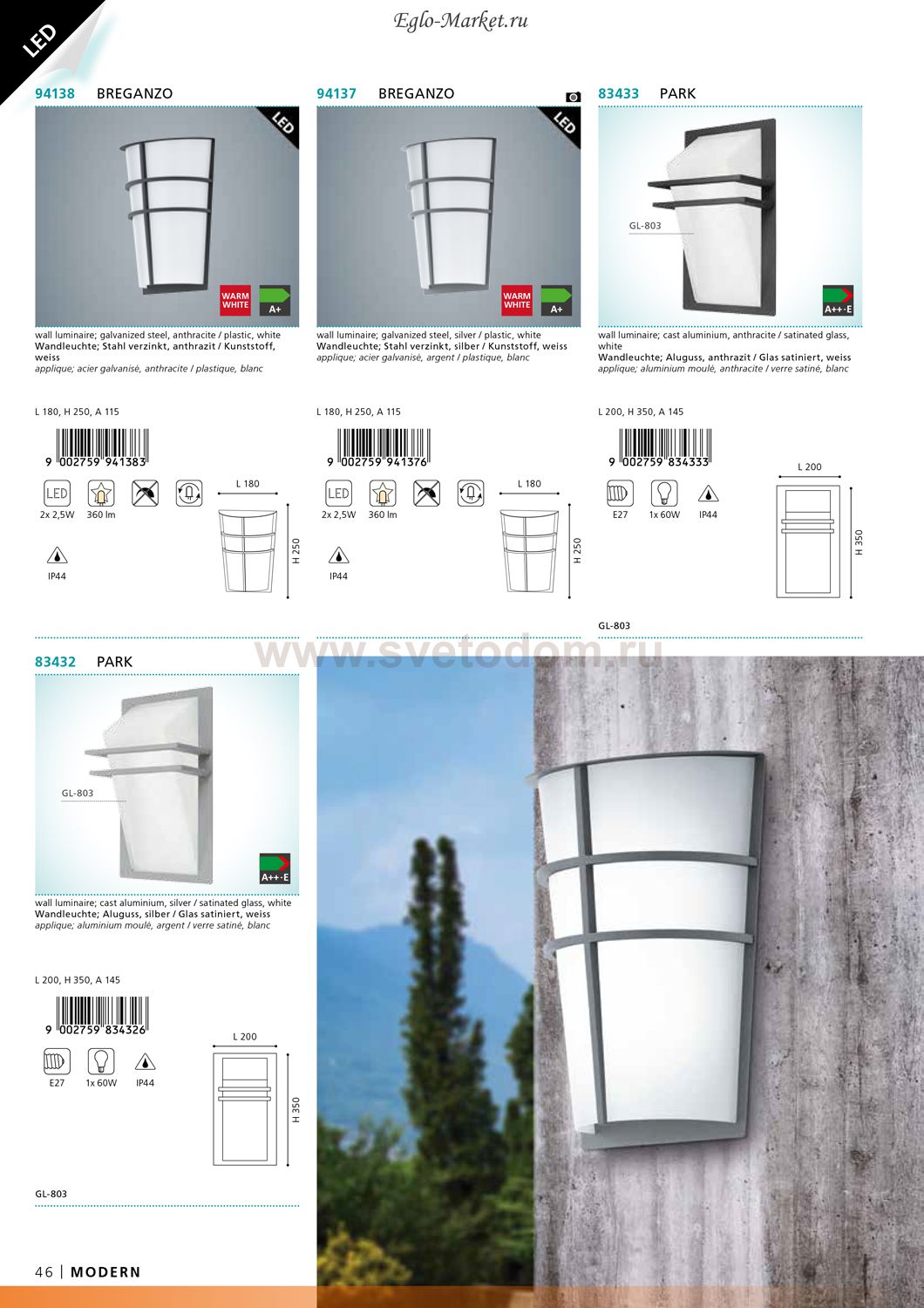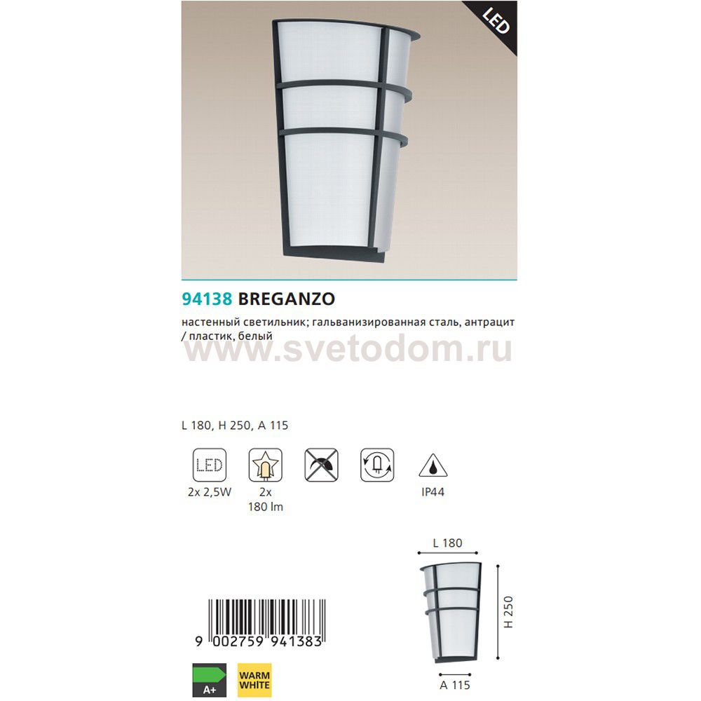 Обеспечение качественного уличного освещения – важная задача для владельцев коттеджей. Компания «Светодом» предлагает современные светильники, которые порадуют Вас отличным исполнением. В нашем каталоге представлена продукция известных производителей, пользующихся популярностью благодаря высокому качеству выпускаемых товаров. Уличный светильник Eglo BREGANZO 94138 уличный не просто обеспечит качественное освещение, но и станет украшением Вашего участка. Модель выполнена из современных материалов и имеет влагозащитный корпус, благодаря которому ей не страшны осадки. Купить уличный светильник Eglo BREGANZO 94138 уличный, представленный в нашем каталоге, можно с помощью онлайн-формы для заказа. Чтобы задать имеющиеся вопросы, звоните нам по указанным телефонам.