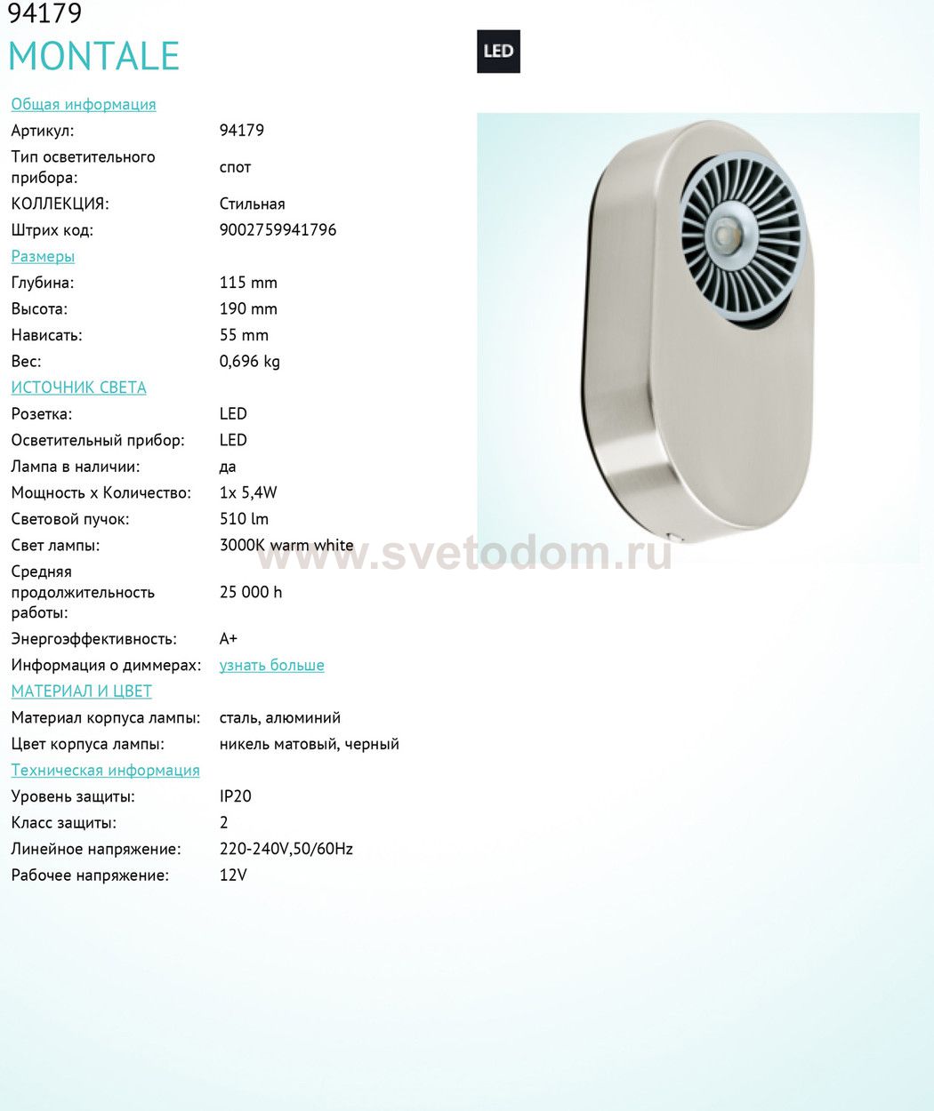 Светильники-споты – это оригинальные изделия с современным дизайном. Они позволяют не ограничивать свою фантазию при выборе освещения для интерьера. Такие модели обеспечивают достаточно качественный свет. Благодаря компактным размерам Вы можете использовать несколько спотов для одного помещения. Интернет-магазин «Светодом» предлагает необычный светильник-спот Eglo 94179 по привлекательной цене. Эта модель станет отличным дополнением к люстре, выполненной в том же стиле. Перед оформлением заказа изучите характеристики изделия. Купить светильник-спот Eglo 94179 в нашем онлайн-магазине Вы можете либо с помощью формы на сайте, либо по указанным выше телефонам. Обратите внимание, что у нас склады не только в Москве и Екатеринбурге, но и других городах России.