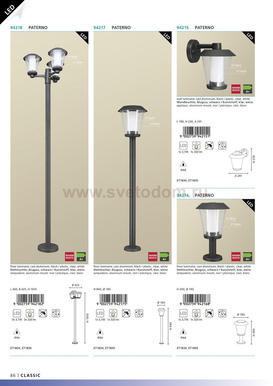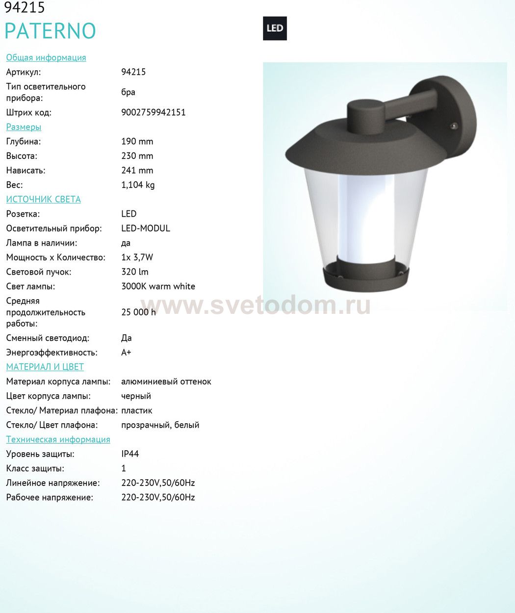 Обеспечение качественного уличного освещения – важная задача для владельцев коттеджей. Компания «Светодом» предлагает современные светильники, которые порадуют Вас отличным исполнением. В нашем каталоге представлена продукция известных производителей, пользующихся популярностью благодаря высокому качеству выпускаемых товаров. Уличный светильник Eglo PATERнет 94215 уличный не просто обеспечит качественное освещение, но и станет украшением Вашего участка. Модель выполнена из современных материалов и имеет влагозащитный корпус, благодаря которому ей не страшны осадки. Купить уличный светильник Eglo PATERнет 94215 уличный, представленный в нашем каталоге, можно с помощью онлайн-формы для заказа. Чтобы задать имеющиеся вопросы, звоните нам по указанным телефонам.