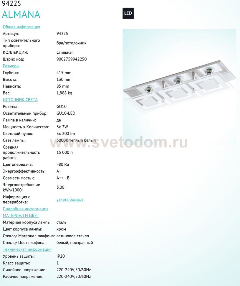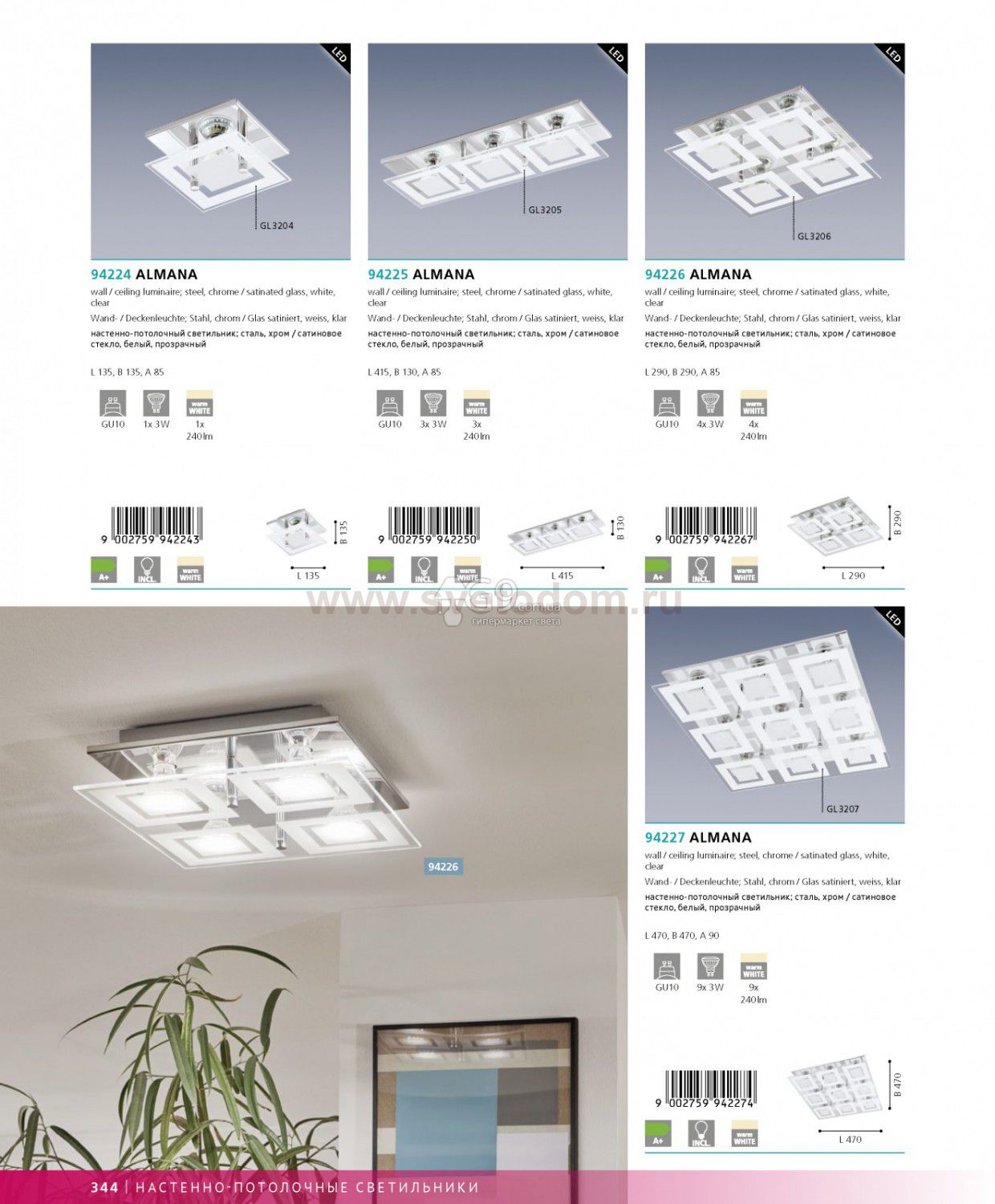 Настенно-потолочные светильники – это универсальные осветительные варианты, которые подходят для вертикального и горизонтального монтажа. В интернет-магазине «Светодом» Вы можете приобрести подобные модели по выгодной стоимости. В нашем каталоге представлены как бюджетные варианты, так и эксклюзивные изделия от производителей, которые уже давно заслужили доверие дизайнеров и простых покупателей. Настенно-потолочный светильник Eglo 94225 станет прекрасным дополнением к основному освещению. Благодаря качественному исполнению и применению современных технологий при производстве эта модель будет радовать Вас своим привлекательным внешним видом долгое время. Приобрести настенно-потолочный светильник Eglo 94225 можно, находясь в любой точке России.