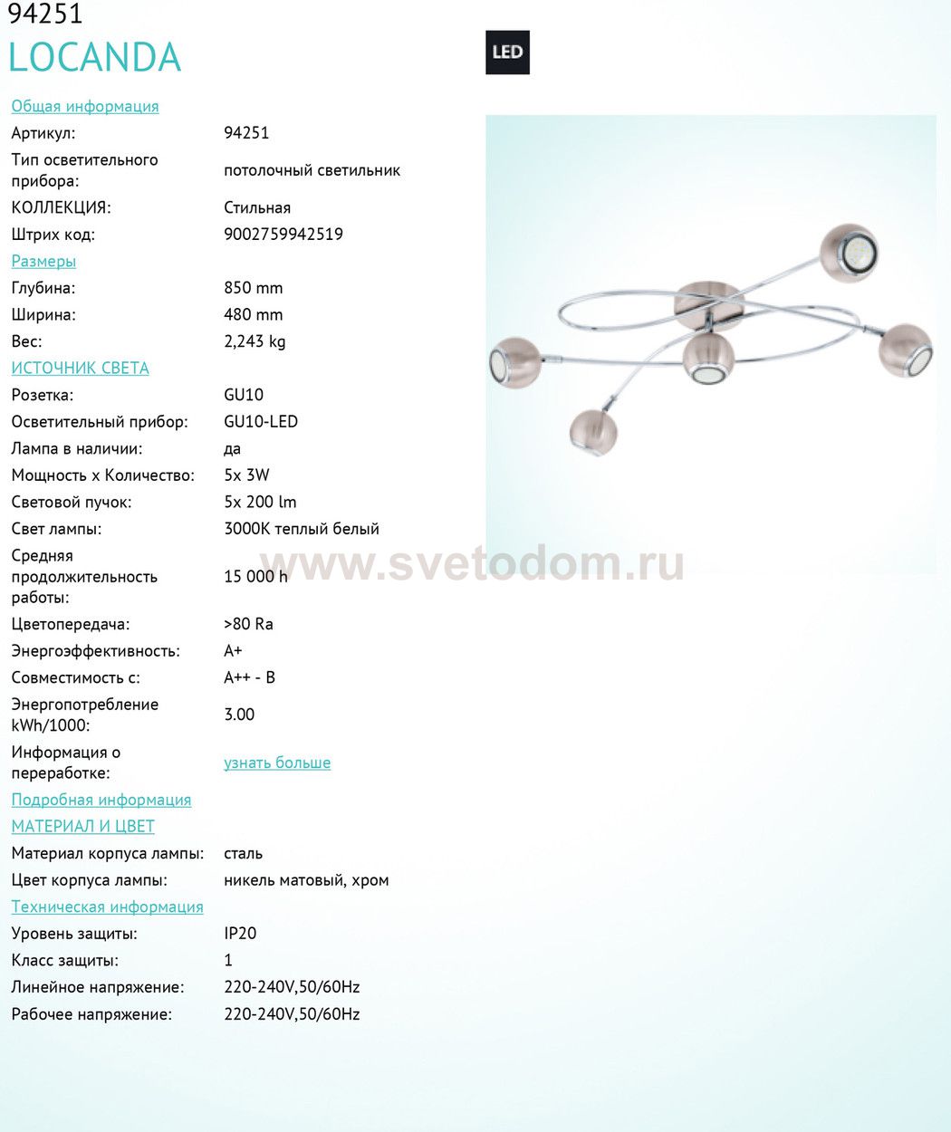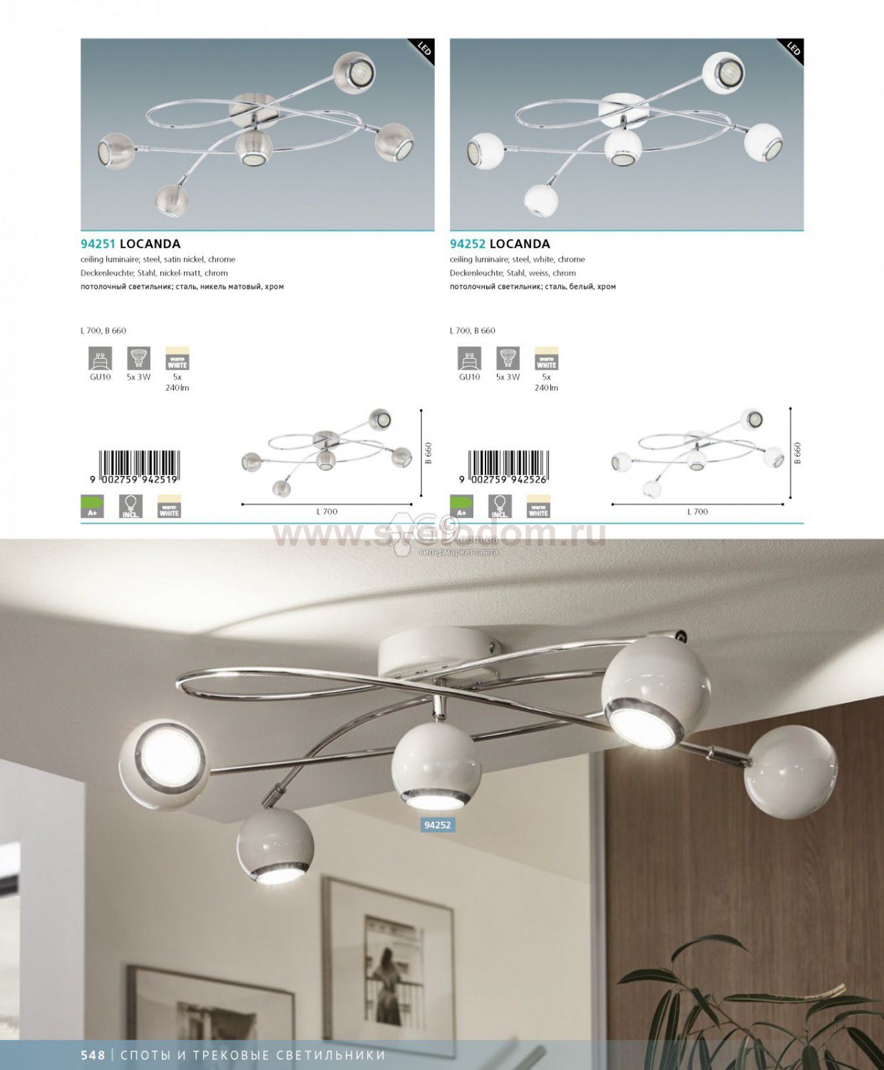 Компания «Светодом» предлагает широкий ассортимент люстр от известных производителей. Представленные в нашем каталоге товары выполнены из современных материалов и обладают отличным качеством. Благодаря широкому ассортименту Вы сможете найти у нас люстру под любой интерьер. Мы предлагаем как классические варианты, так и современные модели, отличающиеся лаконичностью и простотой форм. Стильная люстра Eglo 94251 станет украшением любого дома. Эта модель от известного производителя не оставит равнодушным ценителей красивых и оригинальных предметов интерьера. Люстра Eglo 94251 обеспечит равномерное распределение света по всей комнате. При выборе обратите внимание на характеристики, позволяющие приобрести наиболее подходящую модель. Купить понравившуюся люстру по доступной цене Вы можете в интернет-магазине «Светодом».