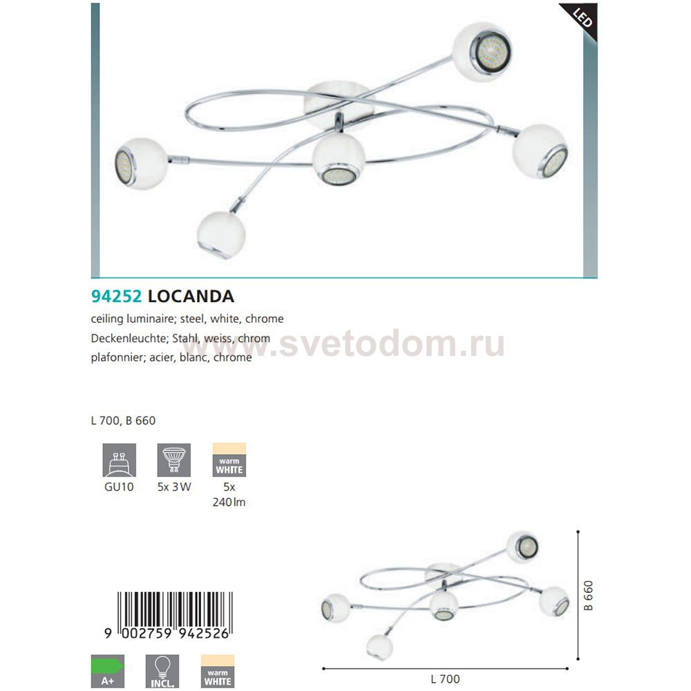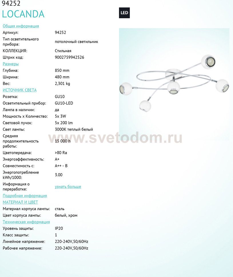 Компания «Светодом» предлагает широкий ассортимент люстр от известных производителей. Представленные в нашем каталоге товары выполнены из современных материалов и обладают отличным качеством. Благодаря широкому ассортименту Вы сможете найти у нас люстру под любой интерьер. Мы предлагаем как классические варианты, так и современные модели, отличающиеся лаконичностью и простотой форм. Стильная люстра Eglo 94252 станет украшением любого дома. Эта модель от известного производителя не оставит равнодушным ценителей красивых и оригинальных предметов интерьера. Люстра Eglo 94252 обеспечит равномерное распределение света по всей комнате. При выборе обратите внимание на характеристики, позволяющие приобрести наиболее подходящую модель. Купить понравившуюся люстру по доступной цене Вы можете в интернет-магазине «Светодом».