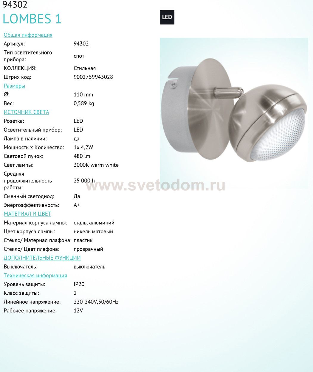 Светильники-споты – это оригинальные изделия с современным дизайном. Они позволяют не ограничивать свою фантазию при выборе освещения для интерьера. Такие модели обеспечивают достаточно качественный свет. Благодаря компактным размерам Вы можете использовать несколько спотов для одного помещения. Интернет-магазин «Светодом» предлагает необычный светильник-спот Eglo 94302 по привлекательной цене. Эта модель станет отличным дополнением к люстре, выполненной в том же стиле. Перед оформлением заказа изучите характеристики изделия. Купить светильник-спот Eglo 94302 в нашем онлайн-магазине Вы можете либо с помощью формы на сайте, либо по указанным выше телефонам. Обратите внимание, что у нас склады не только в Москве и Екатеринбурге, но и других городах России.