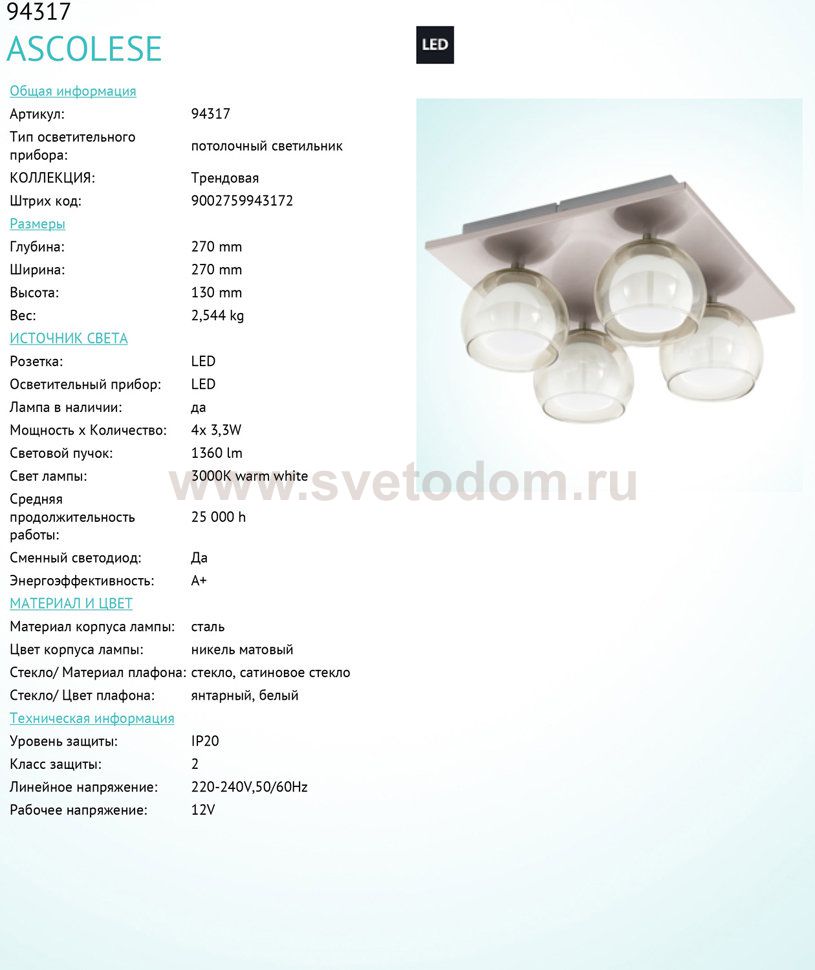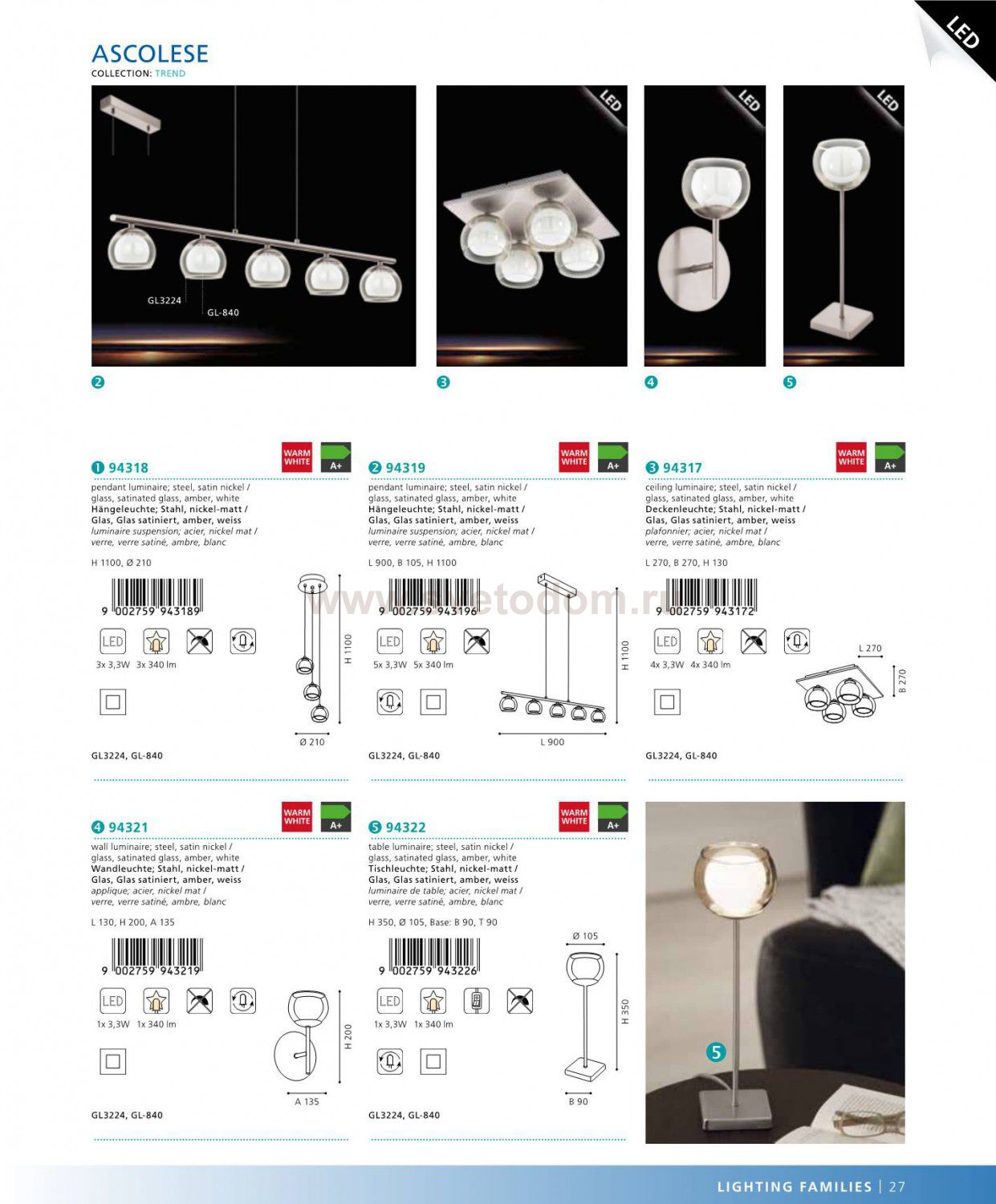 GL-840 GL3224 Отзывы Настенно-потолочный светильник Eglo 94317 ASCOLESEПока нет отзывов об этом товаре, напишите и он обязательно появится после модерации! Оставить свой отзывПохожие товары Другие товары магазина Фото