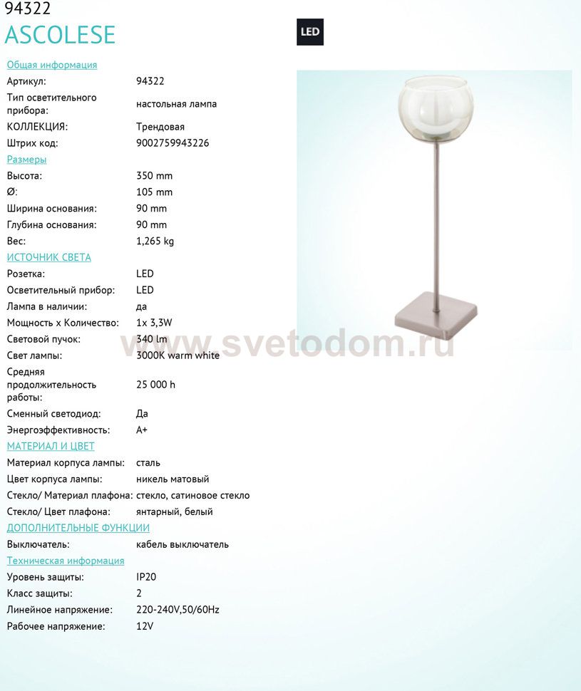 GL3224 GL-840 Отзывы Настольная лампа Eglo 94322 ASCOLESEПока нет отзывов об этом товаре, напишите и он обязательно появится после модерации! Оставить свой отзывПохожие товары Другие товары магазина Фото