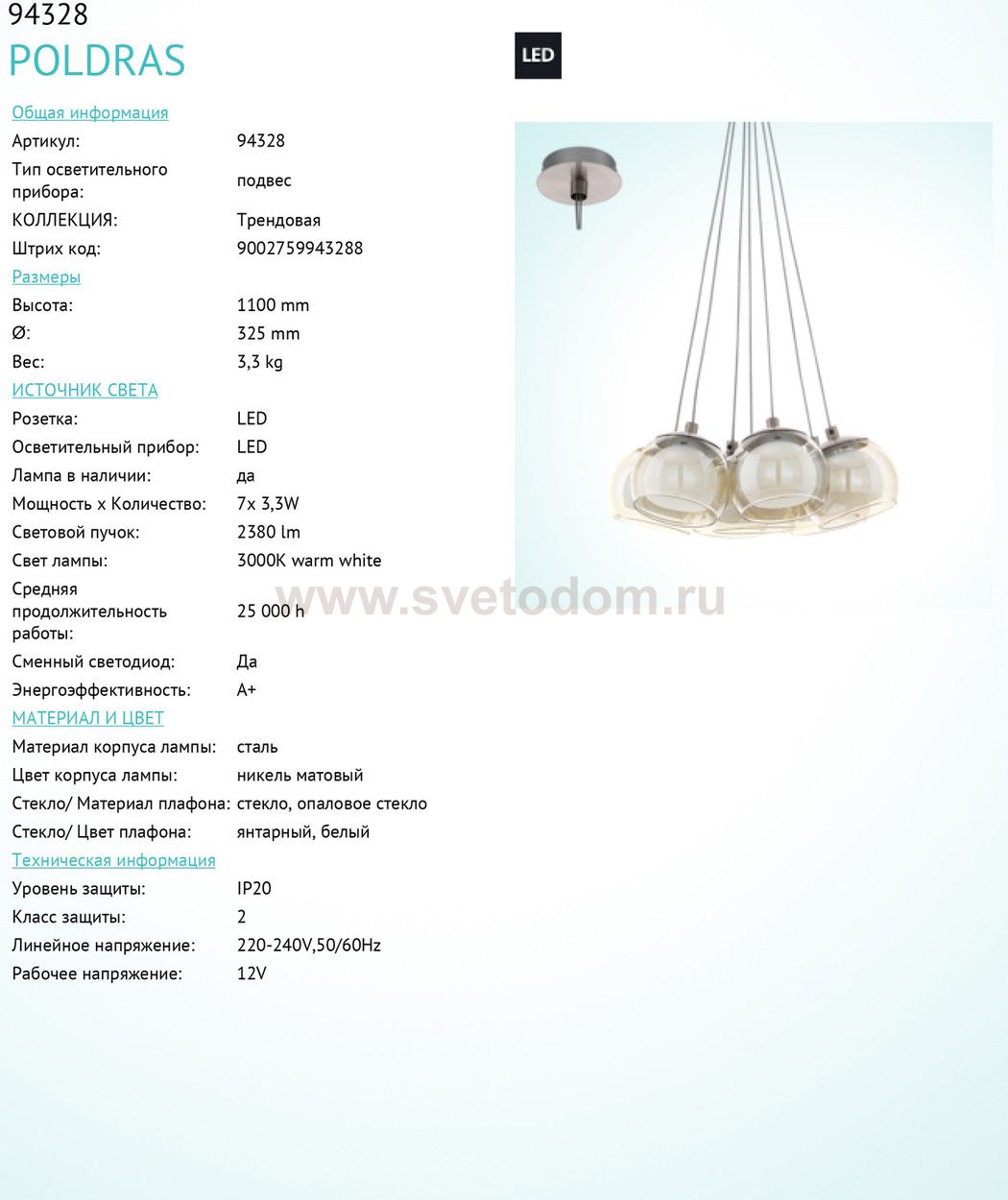 Подвесной светильник – это универсальный вариант, подходящий для любой комнаты. Сегодня производители предлагают огромный выбор таких моделей по самым разным ценам. В каталоге интернет-магазина «Светодом» мы собрали большое количество интересных и оригинальных светильников по выгодной стоимости. Вы можете приобрести их в Москве, Екатеринбурге и любом другом городе России. Подвесной светильник Eglo 94328 сразу же привлечет внимание Ваших гостей благодаря стильному исполнению. Благородный дизайн позволит использовать эту модель практически в любом интерьере. Она обеспечит достаточно света и при этом легко монтируется. Чтобы купить подвесной светильник Eglo 94328, воспользуйтесь формой на нашем сайте или позвоните менеджерам интернет-магазина.
