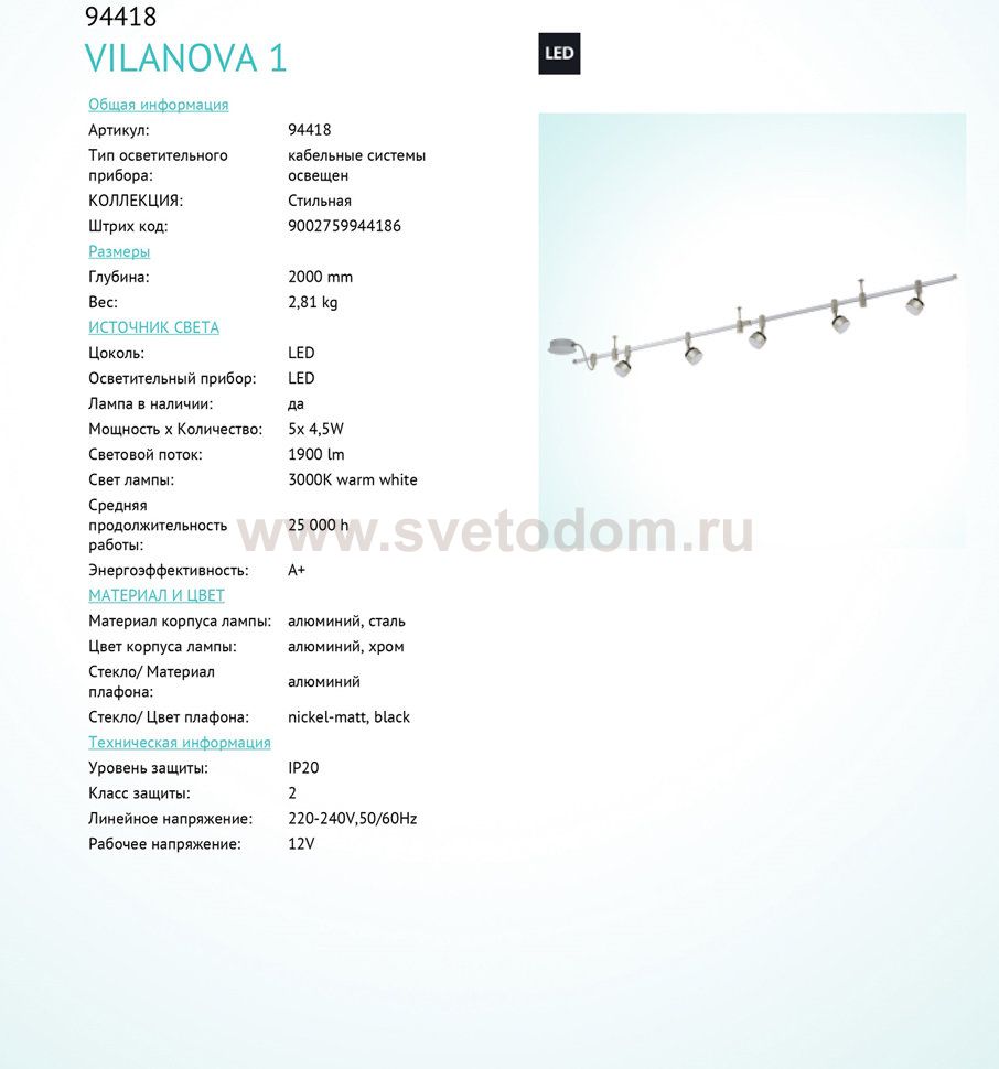 Светодиодная трековая система Eglo 94418 VILANOVA 1 является важной составляющей современного функционального освещения на шинопроводе / треке для гостиной, зала, холла или другого помещения. При выборе обратите внимание на характеристики, позволяющие купить подходящие комплектующие из аналогичной коллекции и в той же цветовой гамме, что сделает помещение по-дизайнерски профессиональным и законченным.