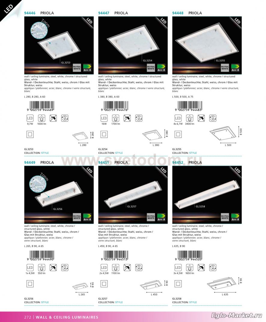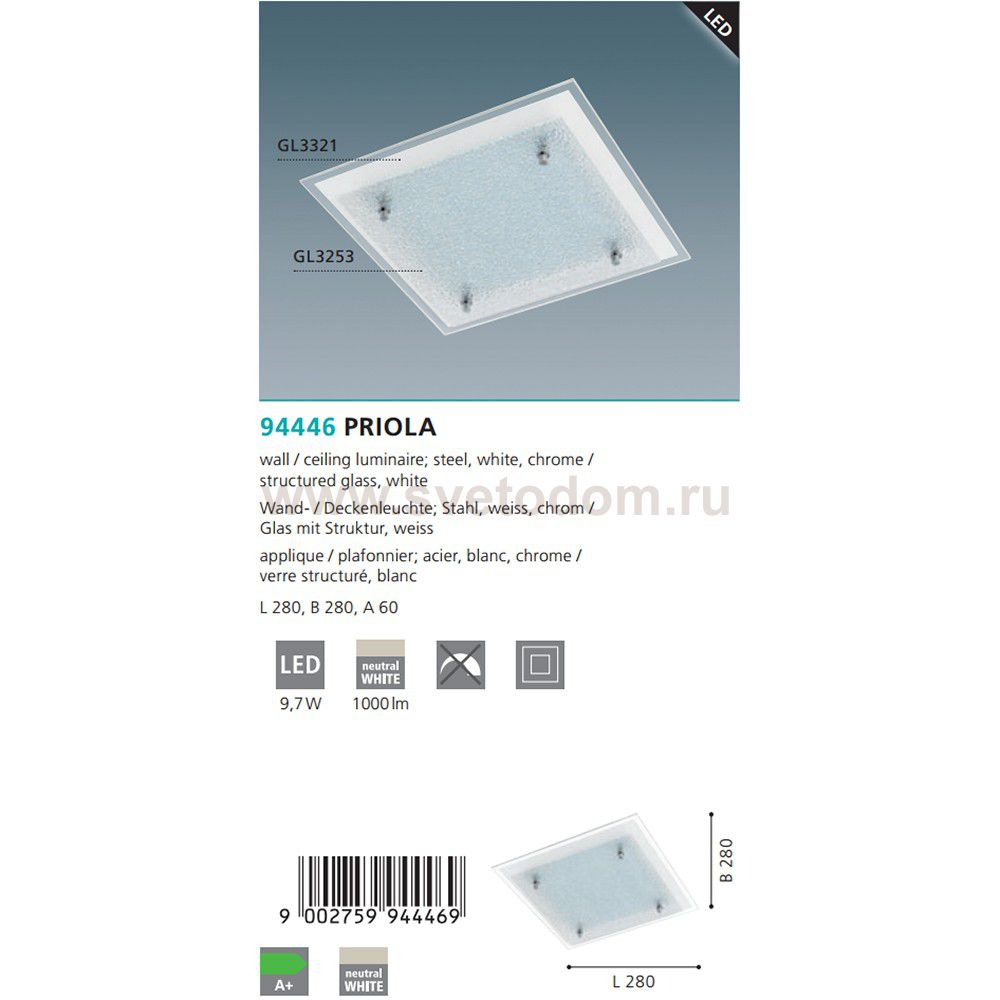 Настенно-потолочные светильники – это универсальные осветительные варианты, которые подходят для вертикального и горизонтального монтажа. В интернет-магазине «Светодом» Вы можете приобрести подобные модели по выгодной стоимости. В нашем каталоге представлены как бюджетные варианты, так и эксклюзивные изделия от производителей, которые уже давно заслужили доверие дизайнеров и простых покупателей. Настенно-потолочный светильник Eglo 94446 станет прекрасным дополнением к основному освещению. Благодаря качественному исполнению и применению современных технологий при производстве эта модель будет радовать Вас своим привлекательным внешним видом долгое время. Приобрести настенно-потолочный светильник Eglo 94446 можно, находясь в любой точке России.